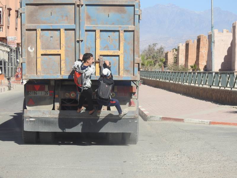 Deze jongetjes liften een eindje met de vrachtauto mee. Rechts de stadsmuur, vaag op de achtergrond de contouren van de Hoge Atlas