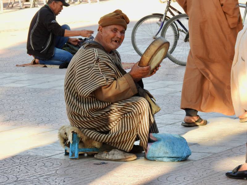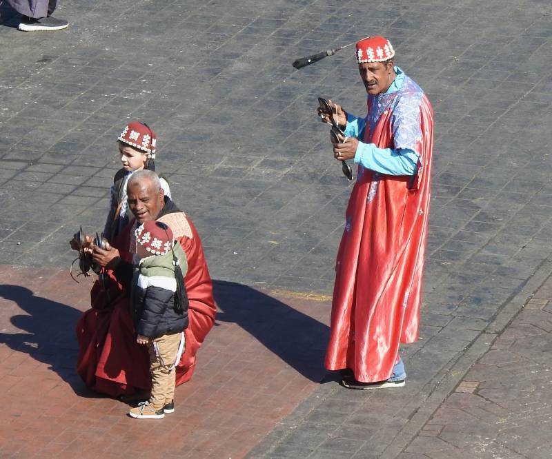 Deze mannen ( en kinderen!) behoren tot een groepje gnaoua muzikanten die later op de dag zullen optreden en nu al een centje vangen