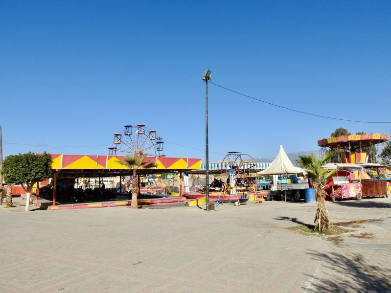Het is dan ook veel drukker dan op een doordeweekse dag nu aan het strand, zeker nu het weer zo fantastisch is. Dus de kamelen-, paarden-,pony- en ligstoelen verhuurders doen goede zaken. Er zijn hier een paar restaurantjes gekomen en er is zelfs een strandmoskee. En de Duivelsrots wordt massaal bezocht, vooral door gezinnen.
