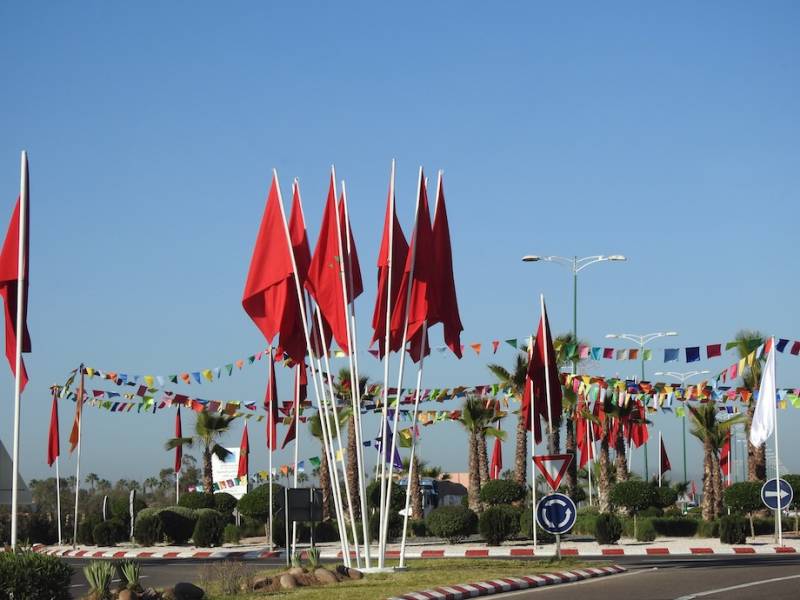 Zeker de helft van de ongeveer 100km naar Agadir stonden er vlaggen langs de weg om de 200m, aan de overkant ook, zodat het een lang rood lint leek. Bij kruispunten en rotondes stonden er trosjes vlaggen, in Agadir waren er vaandels langs de gebouwen huizen, het kan maar 1 ding betekenen , de koning Mohammed VI komt binnenkort op bezoek.