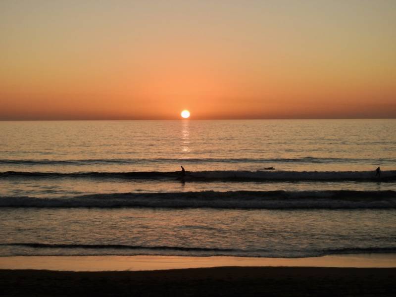 Hier is de zon bijna onder maar ook na zonsondergang zijn er nog surfers in het water