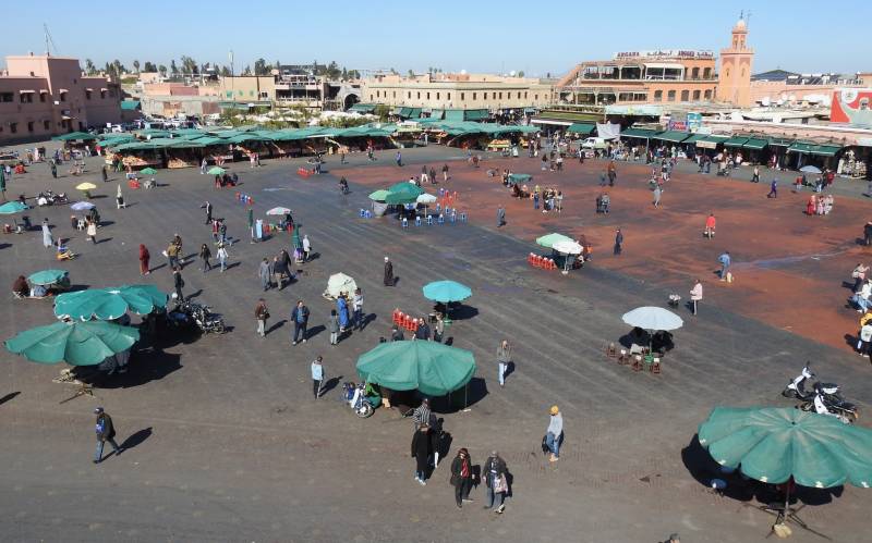 Het Djemaa el Fna plein gezien vanaf het terras, nu is het nog niet druk.
