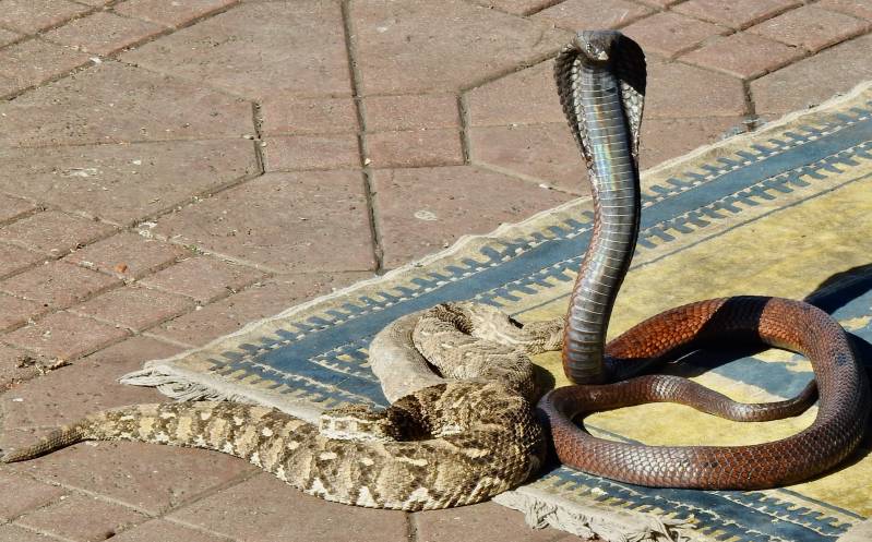 2 slangen op een kleedje bij de parasol van de slangenbezweerder.