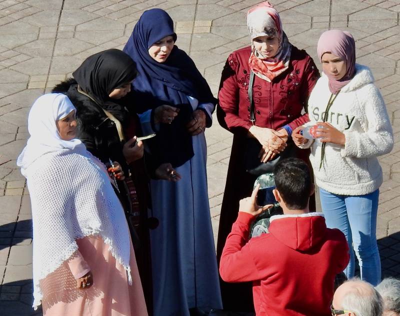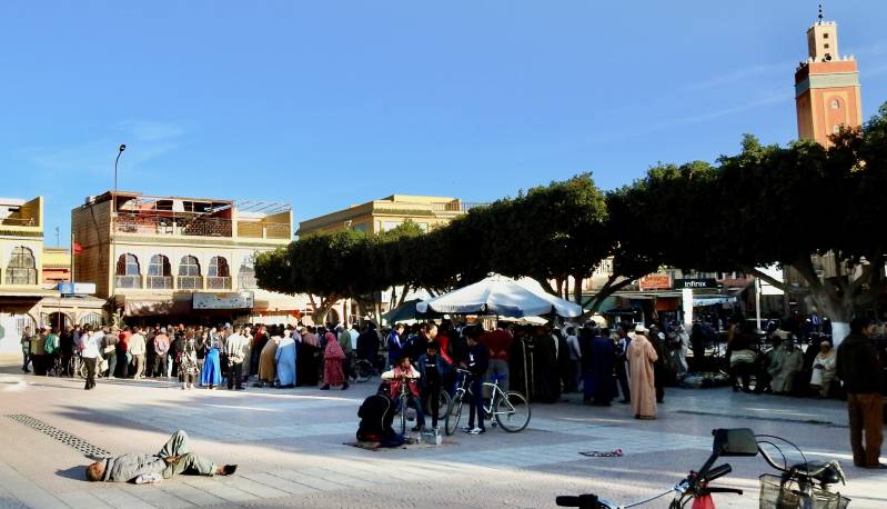 Nadat we vanmiddag hadden zitten lezen bij de camper, zijn we aan het eind van de middag naar het Place Assarag gewandeld om daar weer een jus d’orange te drinken. Er waren nu enkele verhalenvertellers die flink wat publiek wisten te trekken. Een leuk plein dat drukker wordt als het gaat schemeren. Dan is het sowieso een gezellige hectiek in de stad, mensen verplaatsen zich te voet, fiets( zie je veel hier, de stad is mooi vlak) en bromfiets en aan voertuigen ontbreekt het zeker ook niet. Auto’s, handkarren, koetsjes, (muil)ezelkarren, alles wriemelt door elkaar en het gaat wonder boven wonder goed.
