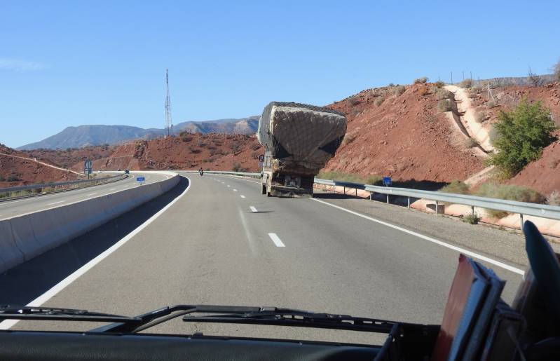 We zijn vanmorgen om 9.30 vertrokken om de 273 km ( 3,5 uur) naar Taroudant te rijden. Daarvan hebben we zo’n 185 km over de tolweg gereden, dat kostte ons 120Dh, nog geen €12,-. Niet de mooiste route maar wel een snelle manier om de Hoge Atlas over te steken. De tijd dat we over de N8 reden, die voor een deel parallel loopt, is voorbij sinds er een tiental jaren een tolweg is. Dat was natuurlijk een mooie route maar als je pech had zat je kilometers bergop achter een vrachtauto die moeizaam puffend, al dan niet beladen met boomstammen, langs de bergheling omhoog kroop. Toen we eindelijk boven de berg waren en er een stuk rechte weg was, zo’n vrachtauto eindelijk in te halen. Maar ja , daar was een doorgetrokken streep dus werden we met een tiental andere auto’s op de bon geslingerd en leverden we onze bijdrage aan de Marokkaanse staatskas, of aan de zakken van de dienstdoende agenten die met hun lasergun verdekt in een greppel lagen, de corruptie was toen nog wijdverbreid.