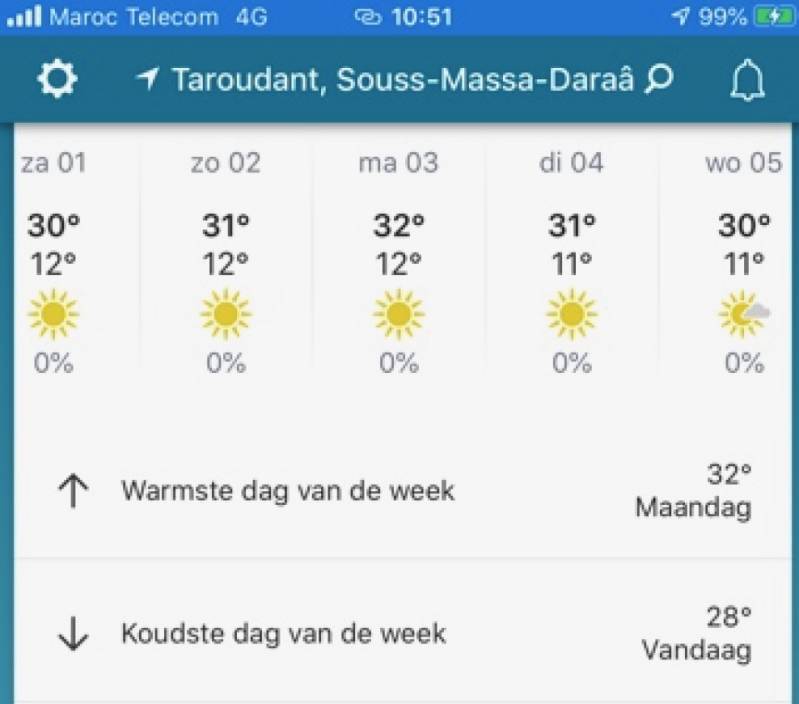 Het was opnieuw een warme dag, het is ongewoon warm in Marokko. Het werd bij aanvankelijk aflandige wind 30º, later bij zeewind koelde het af en tegen de avond hadden we voor het eerst hier een matige wind uit zee.