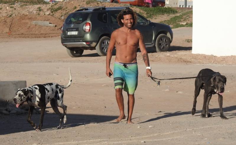 Er staan hier ongeveer 15 campers, er staan bekenden van ons uit de begintijd hier in Taghazout en uit Tafraout. ( Nel en Anne, Judith en Charel, Nel en Wim en Hannie en Cor. Ook hebben we kennisgemaakt met Hans en Marlène, zij zijn voor het eerst in Marokko en vertelden dat oa ons reisverslag het laatste duwtje had gegeven om de oversteek naar Marokko te wagen. Die campers staan zo’n 50m van ons verwijderd. Wij geven de voorkeur ervan om direct aan zee te staan, temidden van het langharig, veelal van dreadlocks voorziene blijmoedig surfvolkje, zowel Marokkaanse als buitenlandse surfers. Naast ons staat een Marokkaanse surfer in zijn oude Mercedes bestel, met wagentje waar zijn 2 bloedhonden in slapen. Waren Marokkanen vroeger vooral bang voor honden, de laatste jaren zie je hoe langer hoe meer Marokkaanse jongens met honden, vaak pitbull-achtige honden of herders, bloedhonden hadden we nog niet gezien.