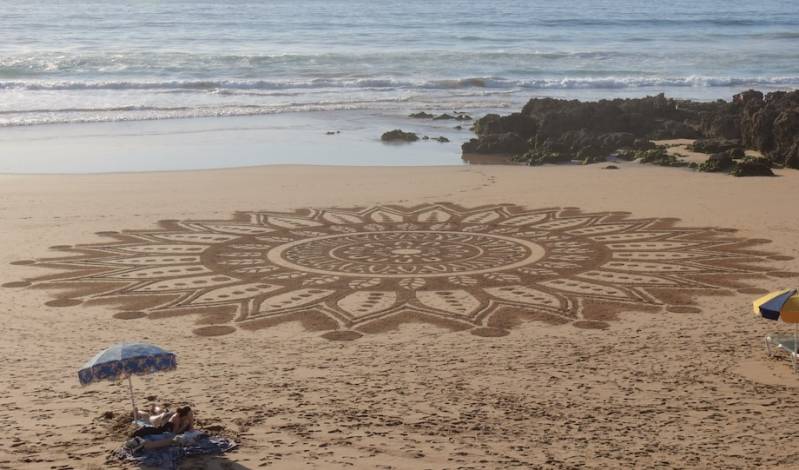Van onze buurvrouw Wil hoorden we dat er op het strand een mooi kunstwerk in het zand was gecreëerd . Het blijkt vanmiddag door een Nederlander te zijn gemaakt, hij is voor het eerst in Marokko . Toen we een foto hadden gemaakt voordat het door de vloed wordt weggespoeld, zagen we 2 heremietibissen vliegen. Een ging er op een paal hier dichtbij zitten. Ze komen van het natuurpark bij Sidi Wassay waar we er vorig jaar veel gezien hebben.
