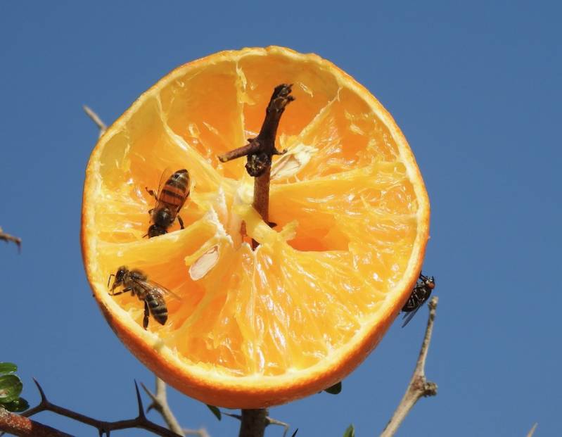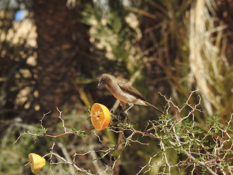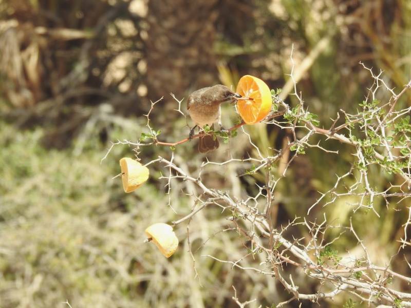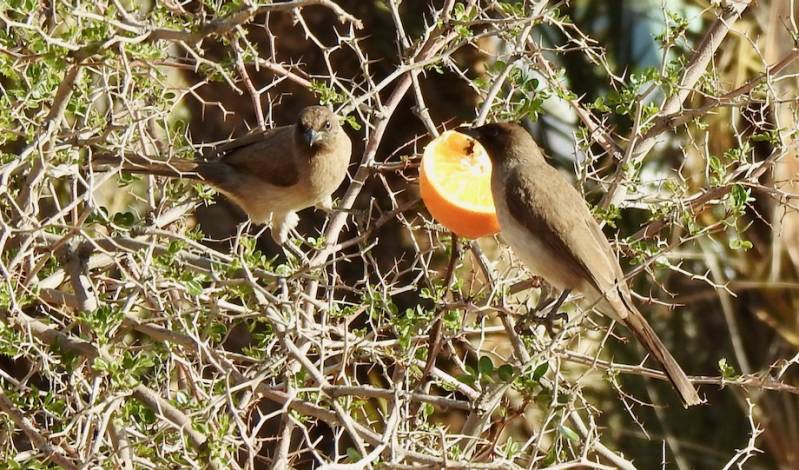 Er zitten hier tamelijk veel grauwe buul buuls in de buurt. Nu zijn die gek op sinaasappels, als je een sinaasappel doormidden snijdt komen daar meteen buul buuls op af die zo’n helft opeten. Soms al vechtend en kwetterend. Een levendige voorstelling voor de camper.