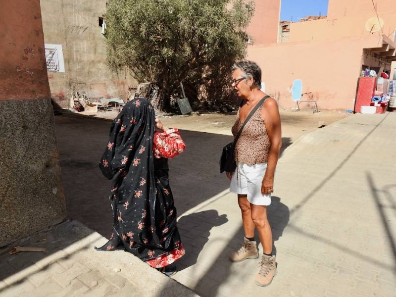 Omdat ik de nacht tevoren maar 3 uur geslapen hadden lagen we al voor half 12 in bed, ik met een slaappil achter de kiezen. Als ik nl een nacht slecht slaap en het zou nog een nacht gebeuren, dan krijg ik een paradoxale reactie , ipv moe zou ik dan hyper worden, speedy. Door die slaappil heb ik bijzonder goed geslapen, ruim 9 uur want we werden pas om 9.00 uur wakker, Everdien was al eerder wakker maar wist niet hoe laat het was. Dat lijkt niet belangrijk en is ook geen ramp maar om 9.00 zou Nezha de was ophalen. Nezha is voor Marokkaanse begrippen een nogal flamboyant type, mooie fleurige kleden wel gedrapeerd als hoofddoek maar zeker niet gesluierd. Wel de nodige make up waarbij het lijkt of er een lijntje getatoeëerd is langs haar opgemaakte lippen. Bovendien strooit ze, als ze weggaat, altijd kwistig met kushandjes.