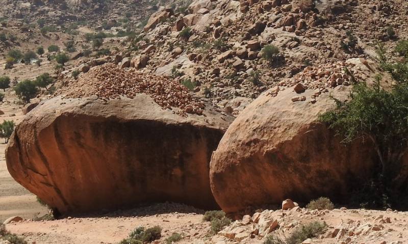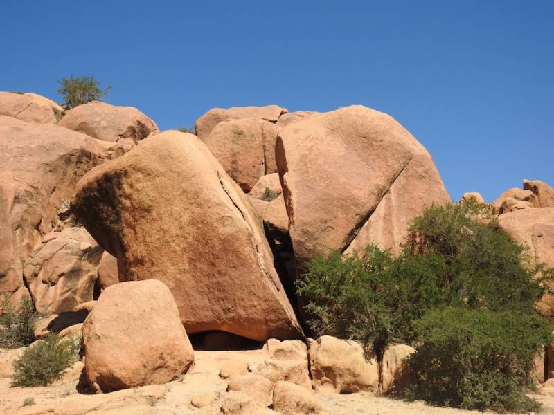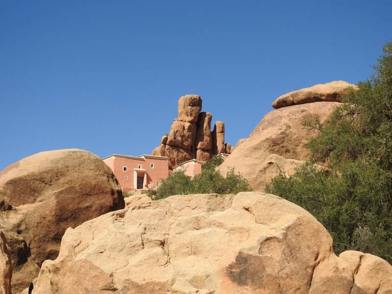 We zijn door de buitenwijken van Tafraout naar het centrum gewandeld, daar zie je aan de kapitale huizen die daar zijn gebouwd dat de Ammeln over het algemeen een rijke stam is. Ze bewonen de Ammelnvallei, waarin zo’n 20 kleine dorpjes liggen. Ammeln zijn ondernemend , ze zijn van oudsher handelaren middenstanders, kruideniers. Ze hebben niet alleen door heel Marokko winkeltjes maar ook in West Europa, het is misschien wel aan hun ondernemende geest te danken dat hier een grote vrijplaats voor campers is. Het is een van onze favoriete plekken in Marokko, we komen hier sinds 2009. De prachtige roze granieten en zandstenen rotsen die rondom de vallei liggen en die door het zonlicht telkens anders kleuren, de mooie rotsvormen, de wandelingen die je hier kunt maken diverse richtingen op, maken dit tot een fantastische plek. Dat het in de loop der jaren steeds drukker geworden is, dat neem je dan maar voor lief.