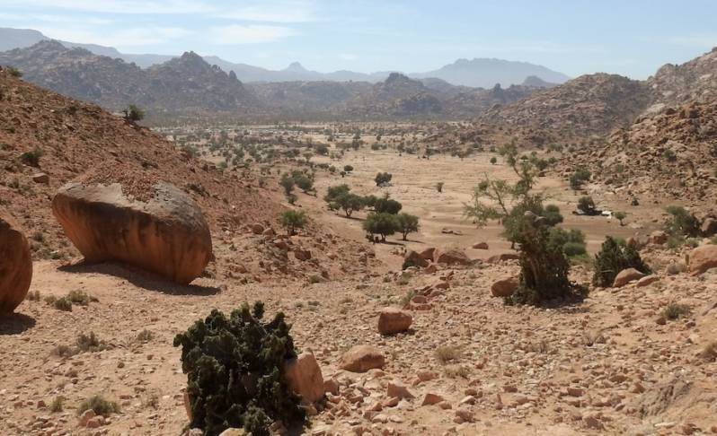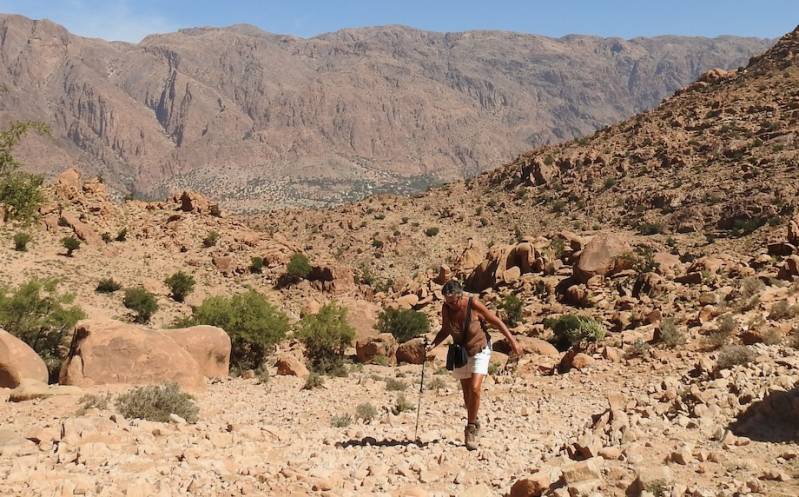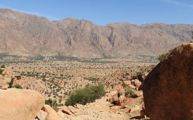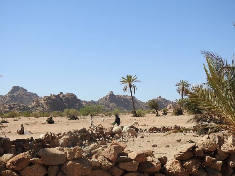 Vanmorgen hebben we een wandeling gemaakt richting de Ammeln vallei. Het duurde even voor we van de camperplaats af waren, we bleven even hangen bij Judith en Dick, waar we een stoel afsloegen want we waren echt van plan een , voor ons doen flinke wandeling te maken. Uiteindelijk vertrokken we om 12.00 uur en liepen richting de bergketen die je over moet om in de vallei te komen. Onderweg zagen we dat er wel 8 tenten stonden, 10 jaar geleden stond er 1 tent met half-nomaden, we hebben nu het idee dat er ook arme sloebers zijn neergestreken voor permanente bewoning. De ‘koralen’ van plastic en doek waar wat geiten en schapen in staan waren er altijd al, ook scharrelen er een ezel en wat kippen rond. We wilden in het Ammelndal terug naar Tafraout gaan liften, maar zover zijn we niet gekomen. We genoten telkens van het prachtige uitzicht, voelden ons nietig maar na een stukje afdaling het dal in leek het ons beter om terug te keren want de asfaltweg was nog ver weg.