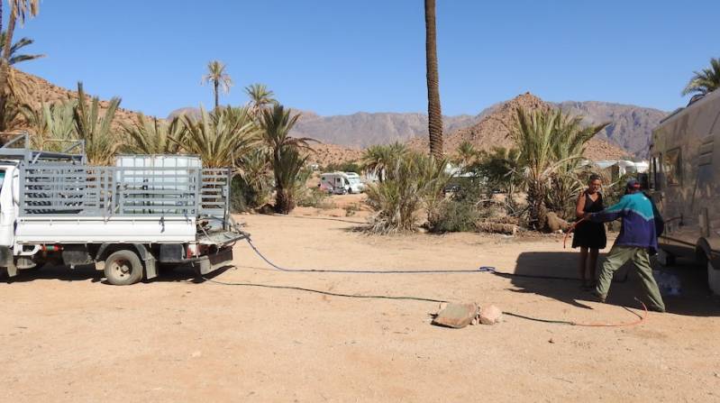 We hebben vanmorgen ook de waterwagen aan de deur gehad om de tank te vullen. Er zijn 2 waterwagens, een grote en een kleine. De grote die rijdt hier al jaren rond, de kleine sinds dit jaar, ze zijn concurrenten van elkaar. De kleine haalt het water uit een bron in de Ammelnvallei, de man pretendeert beter water te hebben dan de grote die het water uit een bron aan de rand van Tafraout haalt. De kleine heeft vergunning van de gemeente gekregen op die voorwaarde dat hij een biljet Non Potable achter op zijn watertank plaatst, een soort concurrentiebeding. Wij hadden vanmorgen de kleine waterwagen, deze kost 30dh, de grote waterwagen 20 Dh.