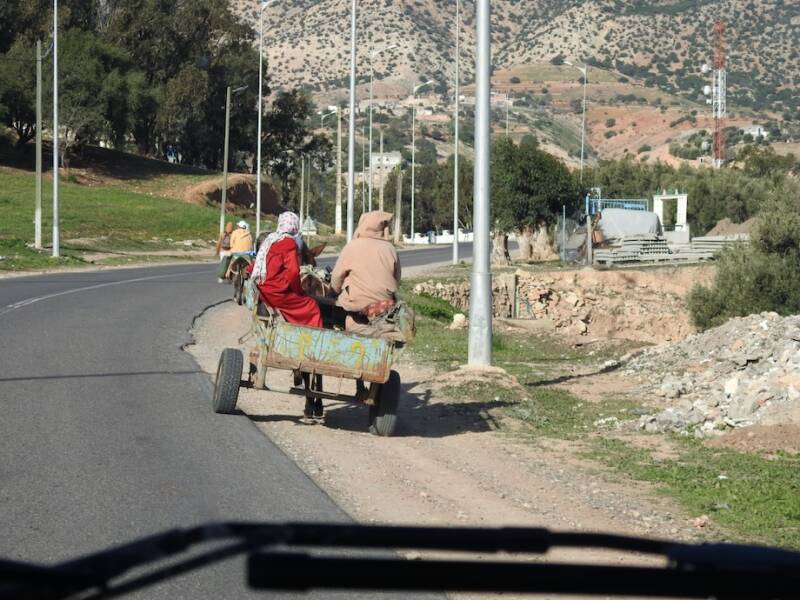 Het eerst 1ste deel van de 170km was vlak, daarna moesten we over een heuvelrug met vrij stijle hellingen waarbij we af en toe achter een vrachtwagen zaten en maar 20km konden rijden. En er werd veel gezwaaid door kinderen of wegwerkers, er was trouwens weinig autoverkeer vonden we. Het kan verbeelding zijn maar wordt er minder auto gereden omdat ook hier inflatie heerst?( inflatie maar eens nader induiken), De brandstofprijzen zullen hoog zijn voor de gemiddelde autorijder in Marokko. Wel zijn er langs de weg karren met kleine Marokkaanse paardjes ervoor om mensen en/of vracht te vervoeren of zit men in amazonezit op ezeltjes, niet alleen als er een souk is..