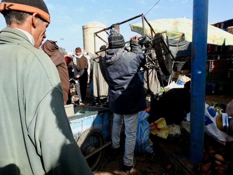 Toen vonden we het tijd om weer richting camper te gaan, de markt liep zo langzamerhand te einde wat goed te merken was aan het verkeer vanaf de souk, die ook nog eens wat tegemoetkomend verkeer moest zien te omzeilen. Want het is een gekrioel van jewelste, het ‘verkeer’ bestaat uit allerhande voertuigen wat zich maar kan voortbewegen op 2 en meer wielen en waar voetgangers dan ook nog tussendoor moeten manoeuvreren. We wilden weer met een Grand Taxi terug naar Ounagha maar we zouden met z’n vieren op een bankje moeten zitten, een oude Marokkaan werd zowat in elkaar gedrukt dus we zijn weer uitgestapt. We hadden geluk dat er net een bus aankwam die langs Ounagha zou rijden dus konden we nog meerijden in de stampvolle bus. Er kwam een kaartjesverkoper langs, 8 Dh p.p en ondertussen piepten her en der kuikens. Toen we waren uitgestapt realiseerden we ons dat we een kaartje hadden gekocht zonder te zeggen waar we heen wilden dus misschien hebben we weel teveel betaald maar voor zo’n luttel bedrag, nog geen €0,80 per kaartje , ga je niet zeuren.