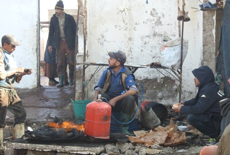Weer verder over de souk geslenterd, je geeft je ogen en andere zintuigen de kost, kijkt naar allerhande producten die verkocht worden en ook naar de mensen natuurlijk die hier veelal gekleed gaan in een donkere boernoes , al dan niet gestreept, met puntmuts, een hoodie avant la lettre. We hebben alleen gezouten pinda’s met vlies, erg lekker, en bananen en mandarijnen gekocht. Na bijna 2 uur slenteren en schuifelen daar waar het druk was, vonden we het tijd worden voor een kop koffie . En wie zaten daar op het terras, juist ja, het leuke viertal die we eerder bij de koeien hadden getroffen. Dus zijn we bij hen aangeschoven , voor een nosnos, koffie met opgeklopte melk die heerlijk smaakte. Even een praatje maakt met een aardige jongeman uit Rabat, hij had veel gereisd en praatte niet alleen perfectEngels maar ook wat Nederlands. Hij was hier bezig met een project voor arme mensen op te zetten die nu in de afrondende fase was. Over arme mensen gesproken, we geven elke dag 1Dh aan een arme sloeber, een broodje kost ook nog steeds 1 Dh. Vandaag hebben we wat meer mensen een Dirham gegeven, we hadden nog wat dagen zonder een gift in te halen zullen we maar zeggen.