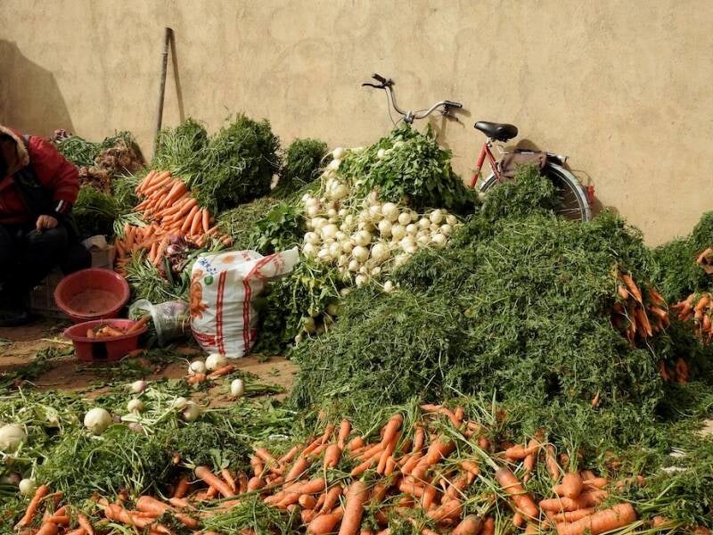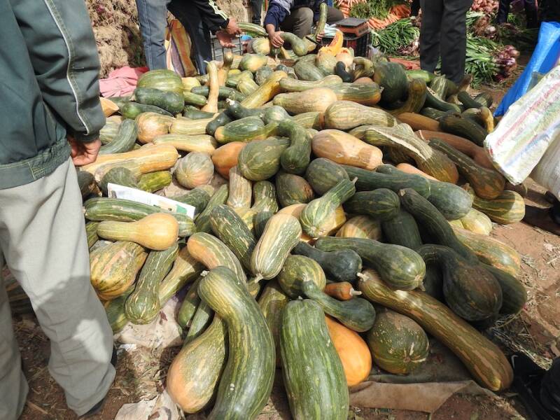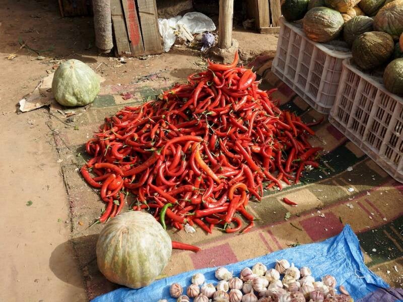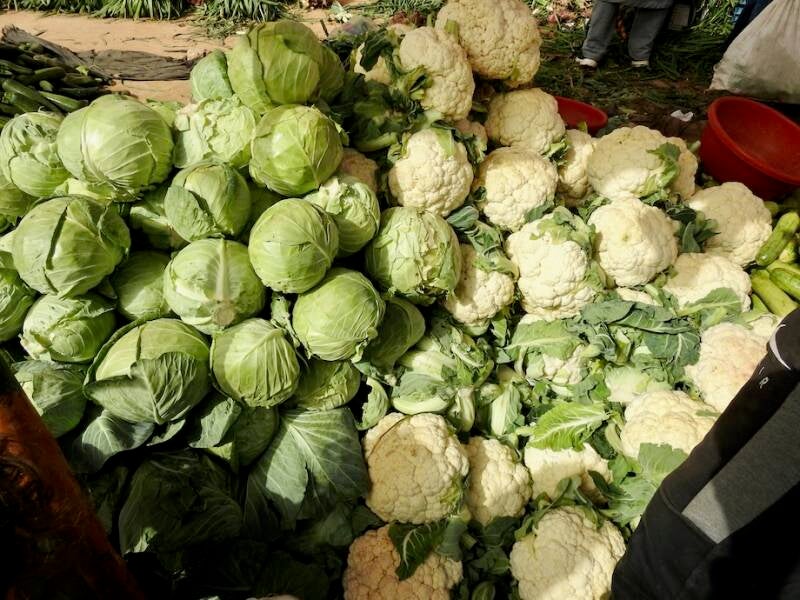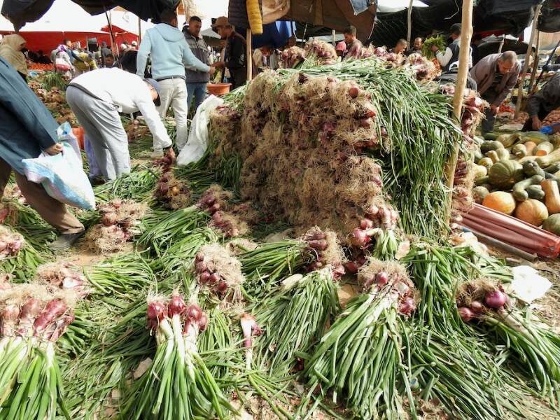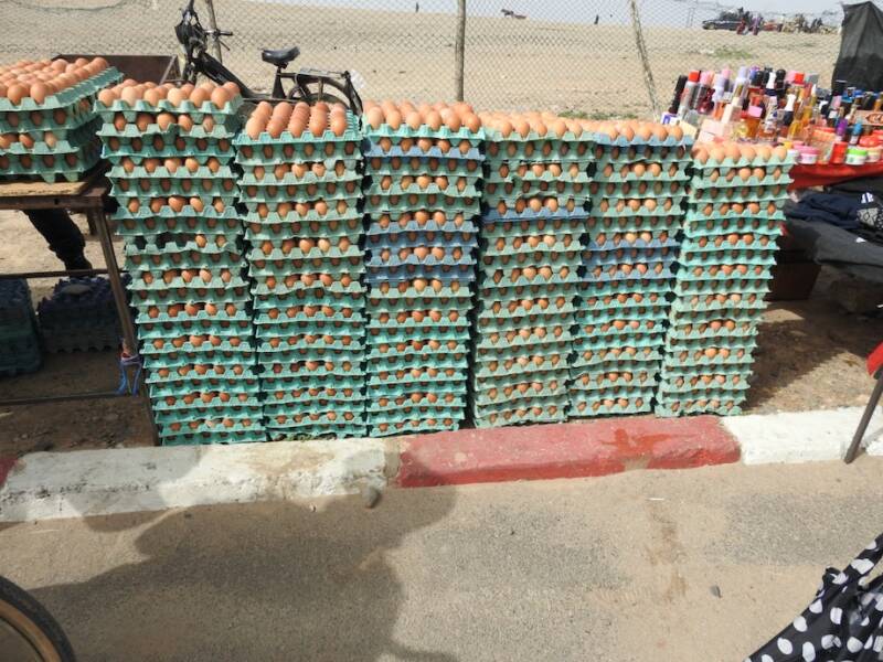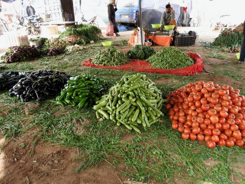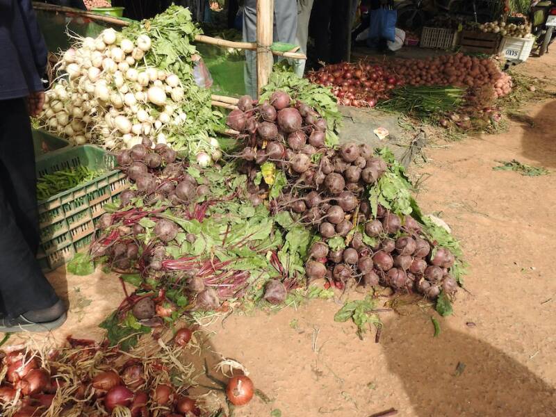 Aan het eind van de ochtend zijn we naar de markt gewandeld om o.a. dadels, zoute vliespinda’s en bananen te kopen en ook weer radijsjes omdat die vorige week zo lekker smaakten. Altijd een genot om over de wekelijkse souk in een dorp/stad te lopen. Niet alleen kleurrijke mensen maar ook de te koop aangeboden waren zijn leuk en soms ook wat wenkbrauwenfronsend om te bekijken. De groenten en fruit zijn over het algemeen van een goede kwaliteit en zijn vaak aanlokkelijk uitgestald.