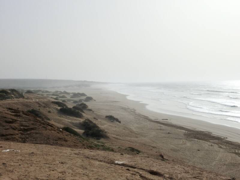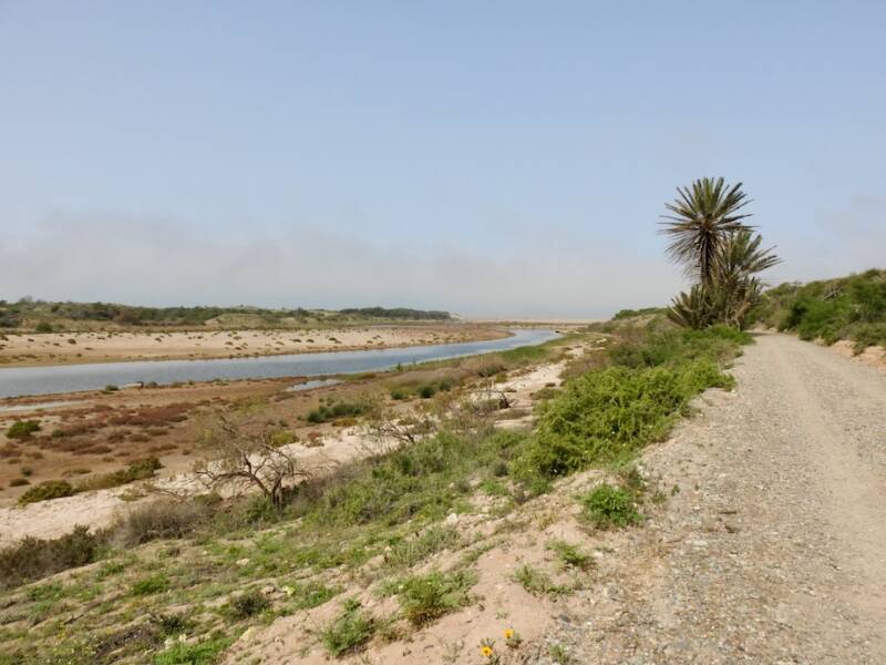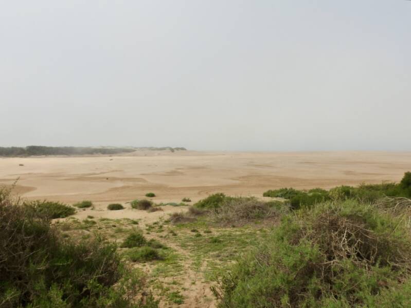 Het voelt weer fijn om hier te zijn bij het natuurpark Sous Massa waar je niet alleen het park in kunt lopen maar ook prima strandwandelingen kunt maken. We hadden het in Agadir warm, 27,5º, hier aan zee met een matige bries is het vanmiddag 23º geworden en het was helaas wat heiig zodat je niet zo mooi over zee keek.
