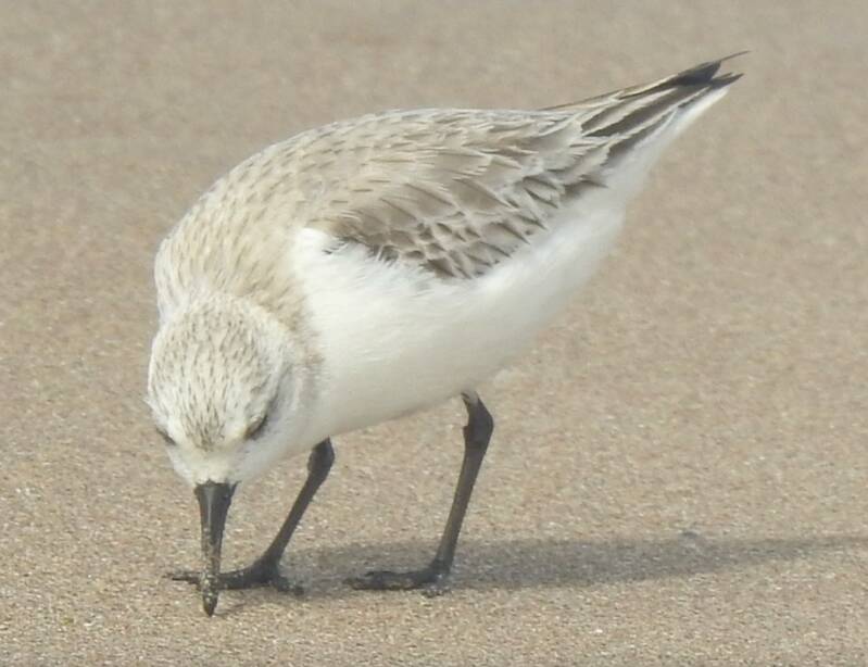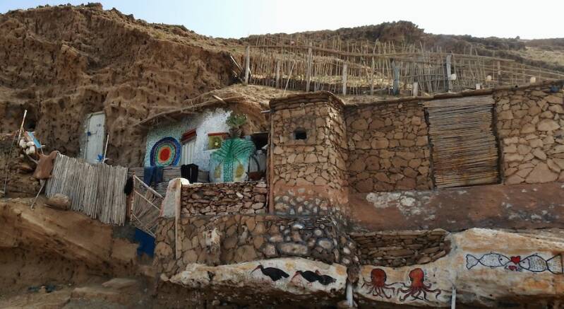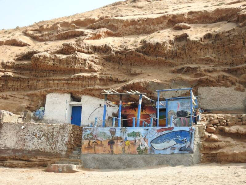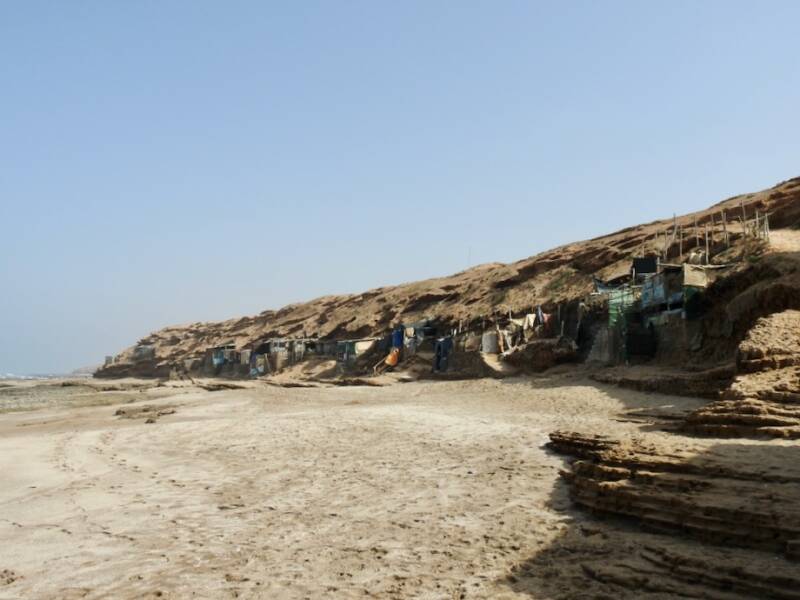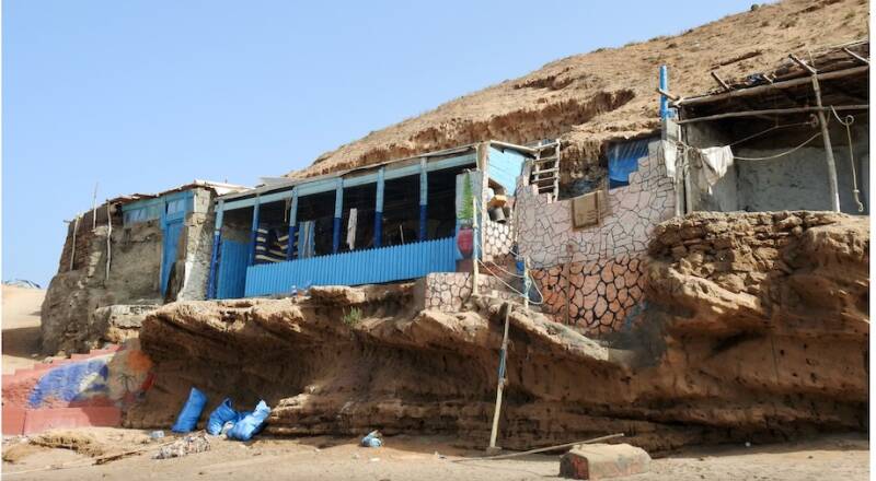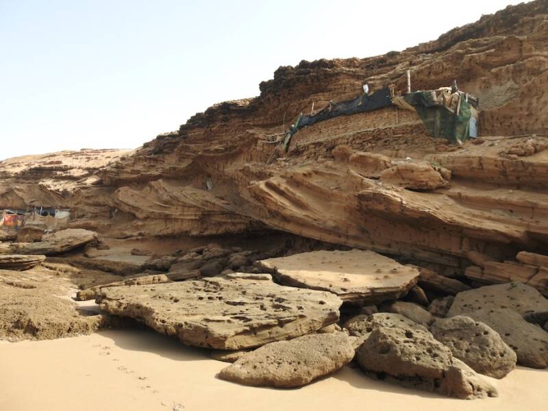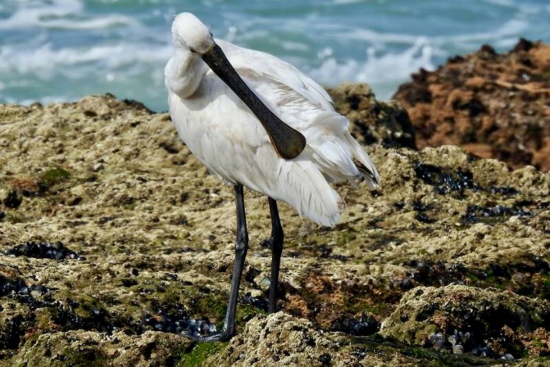Toen de zee-mist in de loop van de ochtend optrok zijn we een wandeling langs de zee gaan maken. Links loop je naar de monding van de Sous, wij zijn rechtsaf geslagen en dan loop je onder langs de rotsen waar talrijke vissershutjes zijn, deels in de rotswand gebouwd. Soms dienen ze als opslagplaats voor hengels en netten, sommige worden nog bewoond en er was een piepklein restaurantje/theehuisje in een ervan gevestigd. Die hebben we vanmiddag niet kunnen ontdekken, ook een slachtoffer van de COVID periode? Een visser nodigde ons uit om binnen te kijken, tevens thee te drinken, erg aardig maar het was ons te steil om naar boven te klimmen, merci beaucoup, c’est tres gentil mais je suis un peus handicapé, c’est trop dur de grimper. De mensen spreken hier over het algemeen goed Frans, sommigen ook wat Engels en Duits door de toeristen die hier in het park vogels komen spotten. We hebben tijdens de wandeling wat lepelaars van dichtbij kunnen zijn toen ze tussen de rotsen foerageerden. Dat was een herkansing van gisteren toen ze ver weg waren. Je ziet meer vogels daar foerageren omdat er genoeg (schelp)diertjes tussen de rotsen achterblijven als het eb wordt.
