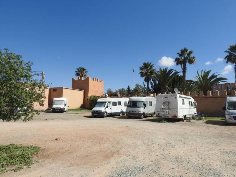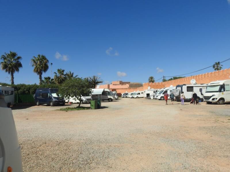 De dag begint altijd met een korte wandeling naar de bakker die net om de hoek binnen de poort is, je bent dan al 3 groenteboertjes en 2 kruideniers gepasseerd waar ze overigens ook brood verkopen , zei het alleen kleine platte ronde broodjes. We prefereren het stokbrood van de bakker, een baguette voor 1,20 MAD en een klein volkoren stokbrood voor 1 MAD. Als je dan weer naar de cp loopt kom je eerst over een kleine oprit, die is nu niet bepaald uitnodigend om verder te rijden als je niet beter weet. Al jaren ligt hier een hoop onduidelijk bouwmateriaal, variërend van gasbetonblokken tot steigerplanken die door onkruid overwoekerd wordt. Maar met de cp zelf is niets mis mee, al wordt er op een merkwaardige manier met afval om gegaan. Je hebt overal wel containers, maar hier moet je alles op een hoop gooien , daarna wordt het ‘gescheiden’ op enig moment van de dag. Plastic flessen worden er uit gehaald, brengen een klein beetje geld op en GFT afval gaat naar het vee. Dat kan toch schoner en eenvoudiger met containers voor gescheiden afval denk je dan.