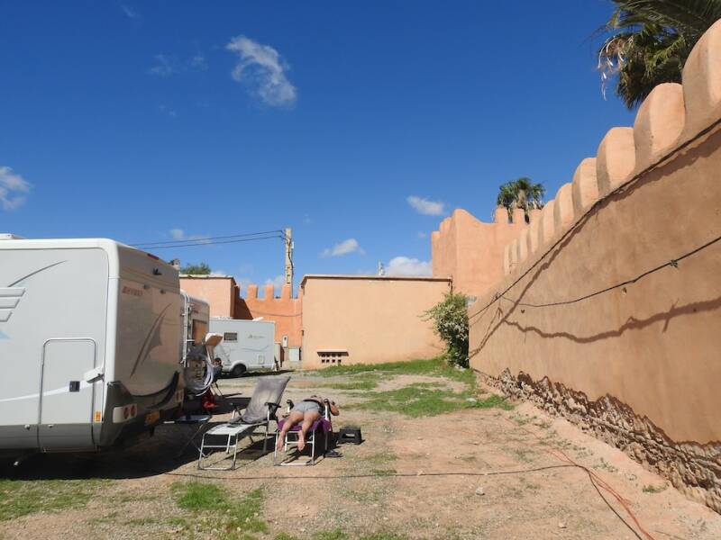 Van uitzicht over de oceaan naar uitzicht over de camping, daar moet je 45 km voor rijden. We werden vanmorgen om een uur of 6 gewekt door windvlagen, de verwachte harde wind was begonnen. We zijn nog in bed gebleven tot het licht werd, tot ongeveer 8. 15 uur. We wilden naar Tiznit en omdat alle campings bezet waren de laatste tijd dacht we er verstandig aan te doen om bijtijds te vertrekken om niet te laat bij de camping waar we het liefst zouden willen staan aan te komen. We waren daar , de Camping Municipal in Tiznit om ongeveer 10.15 uur. We konden nog een plekje krijgen aan het eind van de camping bij de muur, in de zon, enigszins in de luwte. In de loop van de middag raakte de camping vol.