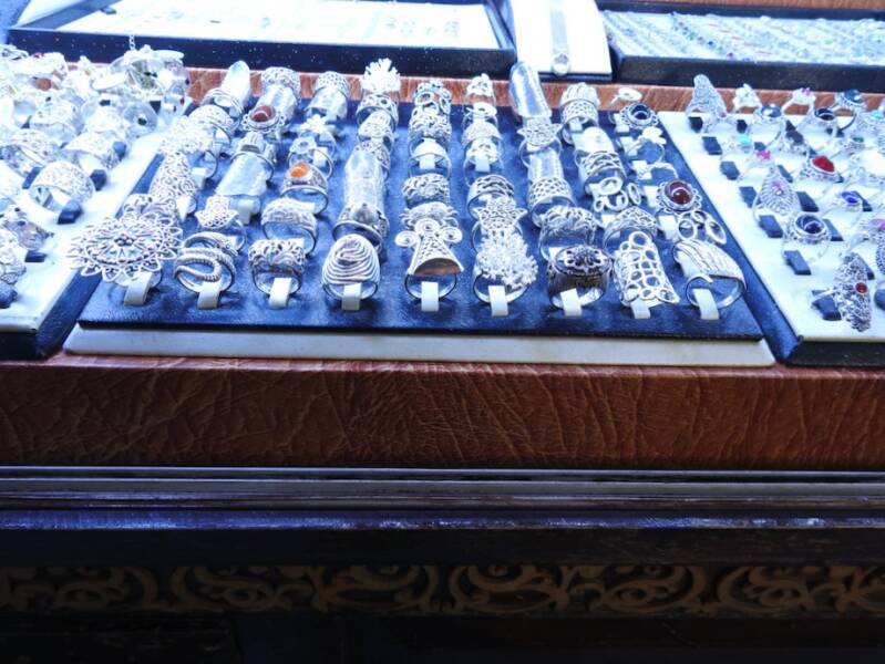 Tiznit was vroeger belangrijk vanwege de productie van wapens en zilveren sieraden en als handelsoverslagplaats van goederen voor de nomaden uit de Sahara. De sieraden vind je nog terug bij de zilvercoöperatie waar we naar toe zijn geweest, zoals altijd wanneer we in Tiznit zijn. Er zijn een stuk of 10 winkeltjes in de corporatie met kleine ateliers, de sieraden worden in vitrines uitgestald Everdien mag daar graag snuffelen of er iets van haar gading te vinden is. En dat was er inderdaad, ze heeft een ring gekocht. En ik deelde ook mee in de feestvreugde want ik kocht een armband die prima past bij een ring die ik heb. We wilden daarna ergens gaan eten maar het werd ‘streetfood’ . We kwamen langs een eenvoudig eethuisje waar ze viskoekjes verkochten. Nu kennen we dat uit Taroudant dus de beslissing was snel genomen. Ieders een sandwich met viskoekjes, hete saus en frieten erop. Bovendien kochten we er ook nog een portie gefrituurde sepia reepjes bij, een soort Marokkaanse calamares en voor 15 MAD, minder dan €1,50 hadden we een smakelijke lunch. We vonden hier de viskoekjes beter smaken dan in Taroudant waar we ze al lekker vonden.