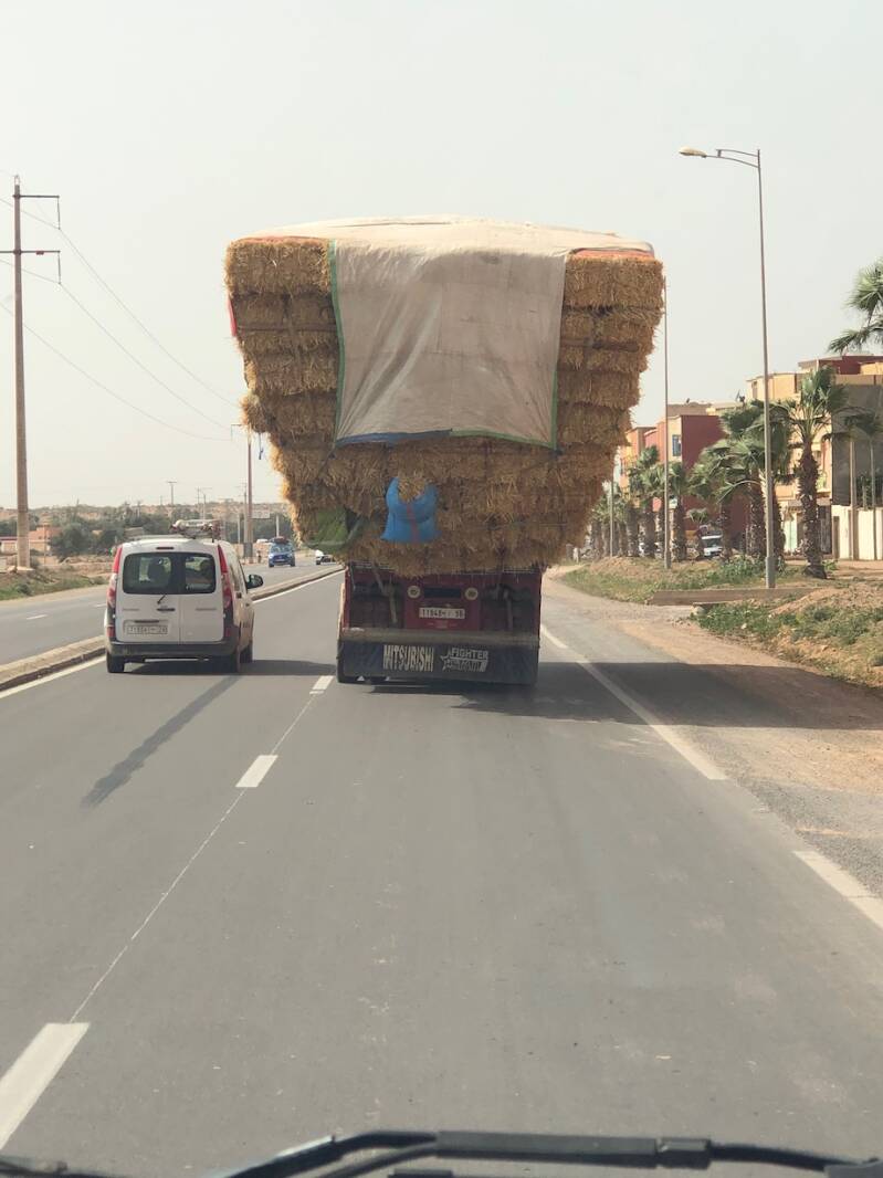 We konden die vrachtauto maar met moeite passeren, de strobalen staken aan alle kanter er ver uit.