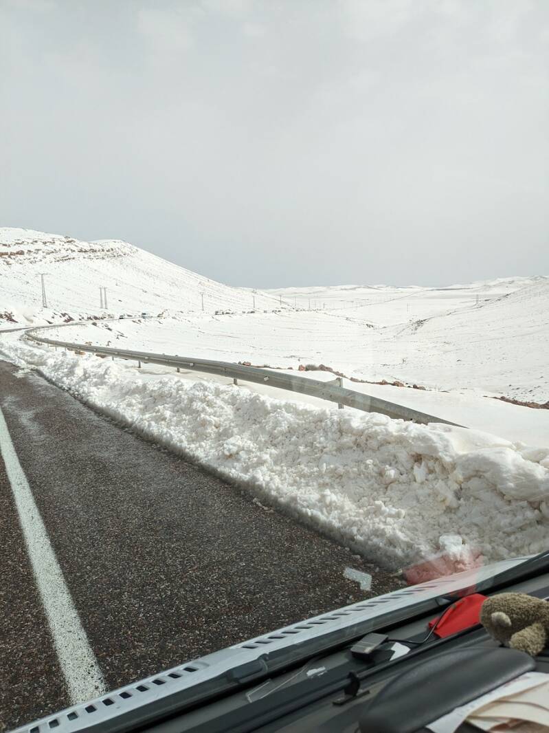 De foto links kregen van Hans Smorenberg toegestuurd, hij is hier gisteren vertrokken naar Aït Ben Haddou. Ze hebben ongeveer 100 km door de sneeuw gereden, de wegen waren wel weer goed begaanbaar gemaakt. Het is winter in Marokko maar wel grote verschillen in temperatuur momenteel.