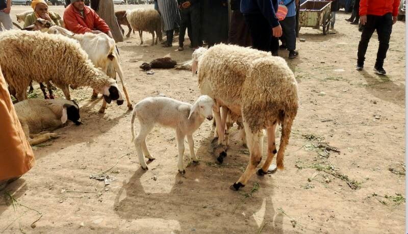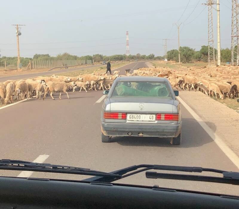 Vanmorgen moetsen we stoppen voor een kudde schapen tussen Taroudant en Agadir.