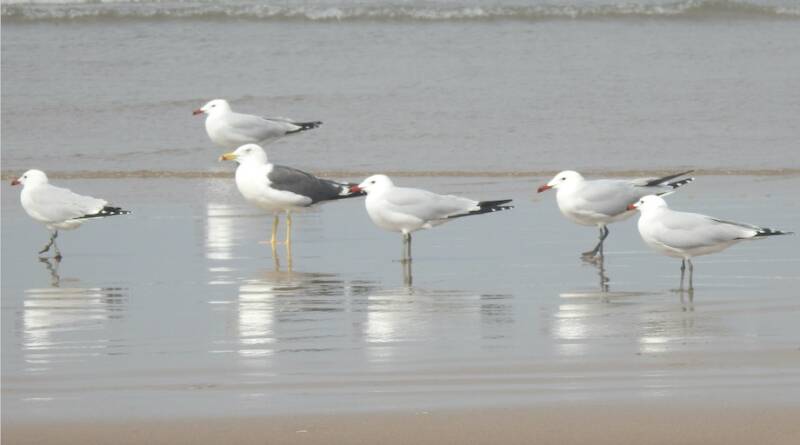 Temidden van Audouins Meeuwen zit een Geelpootmeeuw.