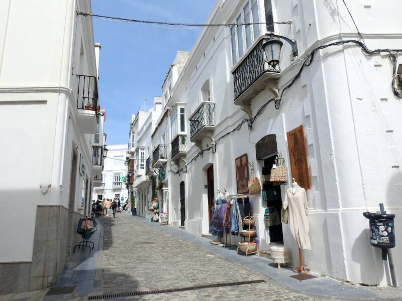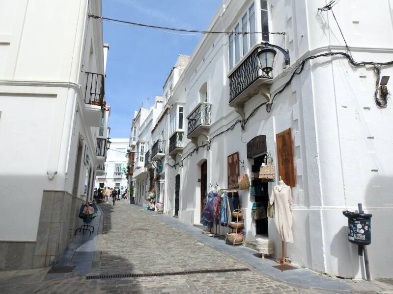 We zijn eerst naar het strand gewandeld, die was nog geen 5 min. lopen, daar was in de verte slechts één surfer, er staat dan ook een aflandige wind, naar schatting 90 km/h. Daarna zijn we naar het historische centrum gewandeld, eerst kom je door een oude Moorse poort de Puerta de Jerez uit de 8ste eeuw. Leuke smalle straatjes met aantrekkelijke winkeltje waar je leuk even kunt snuffelen zie je dan in de oude stad met het kleine centrum. Ik heb daar een nieuw armbandje laten maken door een leuke jonge vrouw die het geleerd had in Amsterdam. Ze was van oorsprong Italiaanse en reed ook wel met de camper door Marokko. We vonden het tijd om naar het officina de Turismo te gaan, daar vond men het tijd voor de siësta, 13.30 uur gesloten, wij waren er om 13.35 uur.