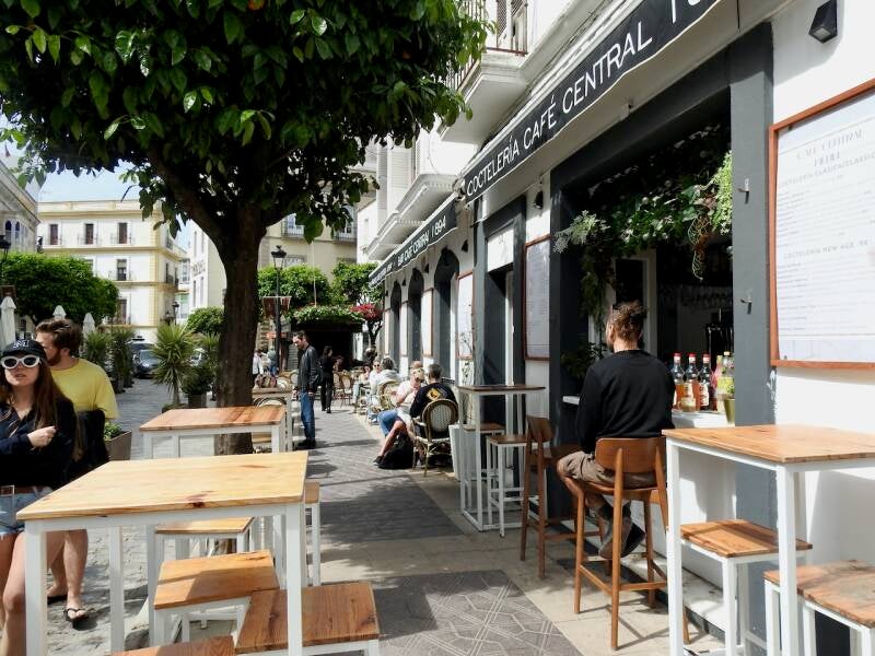 We zijn eerst naar Plaza Santa María gelopen vanwege de bijzondere stervormige fontein met Marokkaanse tegeltjes en 8 keramieken kikkers. Alom gezelligheid in de straatjes rondom, het is zaterdag dus extra druk op de terrasjes. We hebben wat geslenterd door het kleine historische centrum waar we de 2e dag dat we hier zijn al aardig de weg weten. Toch moesten we even zoeken naar de Mercado, de overdekte markt want we wilden vanmiddag tapas eten. In een markthal , is onze ervaring , kun je meestal lekker eten en komt de plaatselijke bevolking ook . We hebben daar chipirones a la plancha (gegrilde kleine inktvisjes) en calamares gegeten. Vervolgens naar een bar om wat anders te proberen, reuzenchampignon gevuld met ham en roquefort, kroketjes met asperges en geitenkaas een een soort patat bravas. We hebben gesmuld , het lekkerst vonden we de chipirones, heerlijk mals. Het eten van verschillende tapas is niet goedkoop, dan kun je beter een menu del dia nemen. Maar wel leuk om verschillende dingen te proberen.