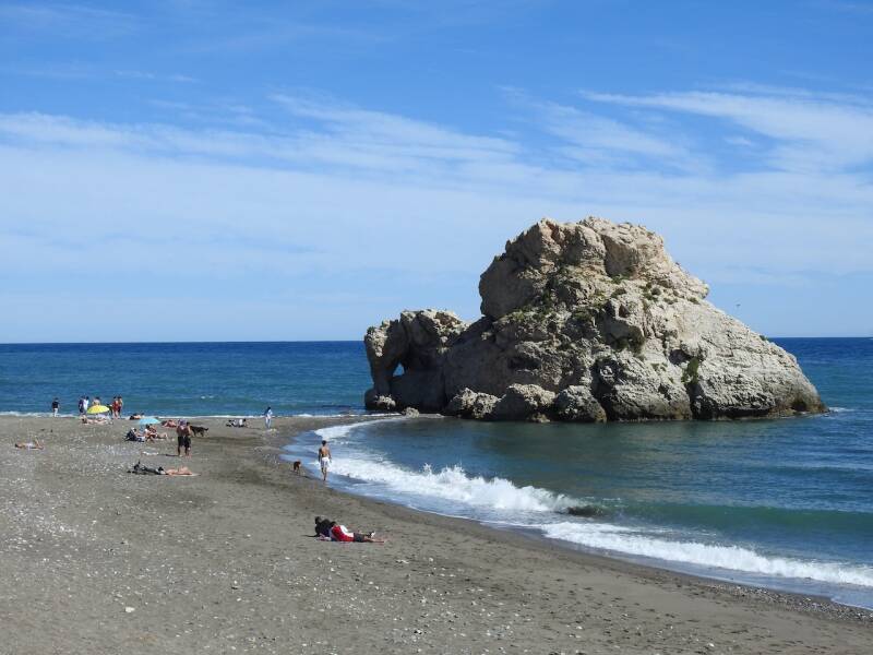 Vervolgens dezelfde weg terug als 3 dagen geleden maar nu náár Algeciras en daar hebben we de AP 7 genomen, de tolweg die ons naar Málaga bracht, Daar was het kneiterdruk want we moesten net ten noorden van Málaga zijn dus gingen we dóór Málaga, wel over de snelweg en het verkeer reed gelukkig mooi door. We zijn naar een P4N plekje gereden op een kleine parking aan het strand. De plekken op de eerste rij, met zeezicht zijn bezet, wij staan iets meer naar achteren . Er kwam aan het begin van de avond wel een plekje vrij met zeezicht maar we gingen daar niet staan omdat er nevel van zeewater tegen de campers werd geblazen door de wind die vrij stevig woei . Er zijn hier rotsen ,geen zandstrand, dus daar slaan de golven tegen aan .