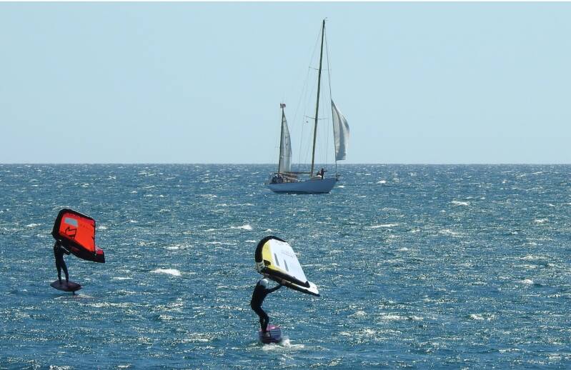 Wingsurgers en een zeilboot met gestreken groot zeil vanwege de de harde wind.