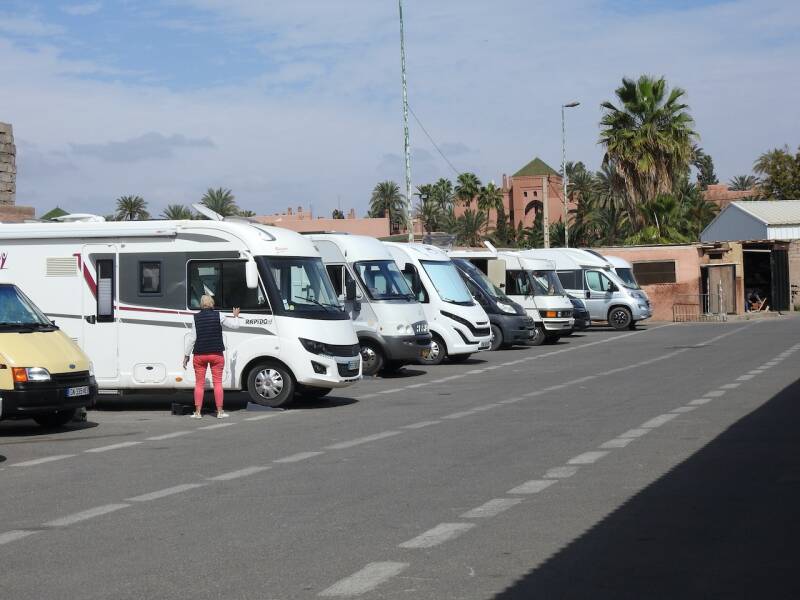 Zondag rustdag, voor het grootste deel kwam dat wel uit vandaag. Gisterenavond kwamen er 2 Spaanse busjes, jonge ouders met kinderen en die waren tot laat, een uur of 12 lawaaierig, een gedrag wat Spanjaarden niet vreemd is, de Semana Santa is begonnen. Toen we gingen slapen was het stil, dat was louter toevallig. En alweer geen muezzin om 6.15 uur, ook nu bleef het stil, gelukkig maar omdat ik dit keer goed heb geslapen, het korte slapen van de vorige nacht had kennelijk niks met de medicijnen te maken maar was toeval. Toen we opstonden werd het zwaar bewolkt, eerst scheen er nog een waterig zonnetje. Omdat er voor vandaag regen werd verwacht, de meest sombere verwachting was van de Apple weerapp waar we doorgaans vertrouwen in hebben die om 11.00 uur motregen voorspelde , besloten we om naar een camping te gaan, dat leek ons beter als je toch de stad niet ingaat. We stonden op de cp bij de koutoubia wel erg dicht boven op elkaar, een beetje meer ruimte leek ons toch prettiger , ook al zou je binnen moeten zitten vanwege de regen. We vertrokken om een uur of half 10 (8.30 Marokkaanse tijd) en zoals we , (ik althans) verwacht hadden was het tamelijk rustig op de weg. Nu had Everdien wat slechter geslapen, geplaagd door herinneringen aan de hectiek van het verkeer van 2 dagen geleden. Het was maar 15 km , uitgeleide gedaan door een horde okergele petit taxi’s waren we snel voorbij de overstapplaats ( grand taxi’s mogen maar tot de stadsgrens ) en toen werd het rustiger op de weg tot we de N9 bereikten. Deze was zelfs heel rustig en aan deze uitvalsweg naar de tolweg ligt ook de camping El Ferdaous, een camping die prima is, iets meer basic dan Le Relais de Marrakech waar we vroeger wel stonden, maar hier zijn wat winkeltjes en een restaurantje in de buurt en zoals gezegd aan de N9.