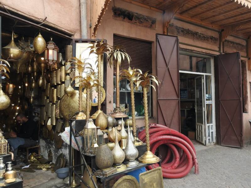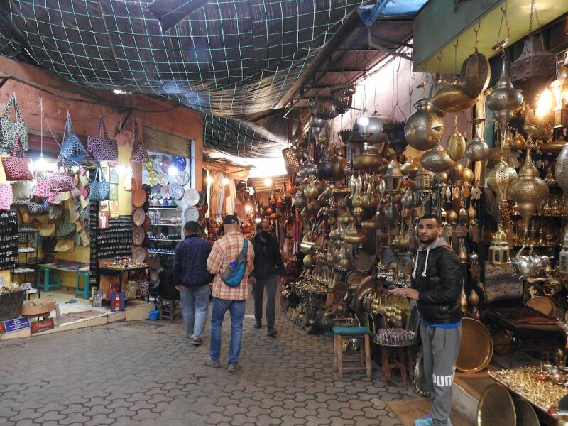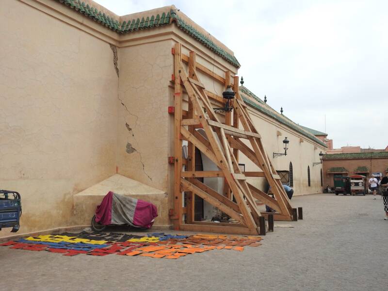 De aardbeving van afgelopen oktober heeft ook in Marrakech schade aangericht, niet alleen in de medina aan wat huizen en aan de stadsmuur maar ook aan historische monumenten zoals het Paleis Bahia en de Saadische tuinen, die dan ook ( voor een deel) gesloten zijn, hoewel Palais Bahia gewoon weer geopend is volgens onze vriendin Trui die daar pas nog geweest is.. Jammer maar die hebben we al meerdere malen bezocht. Evenals de medersa Ben Youssef, maar die is geopend dus zijn we daar naar toe gewandeld, 1,7km , dat was te doen met mijn voet dachten we , gisteren hadden we ook bijna 5 km gelopen.
