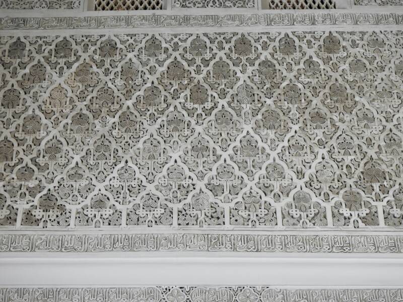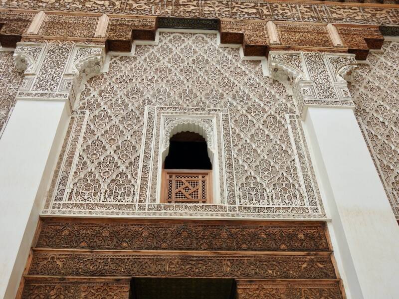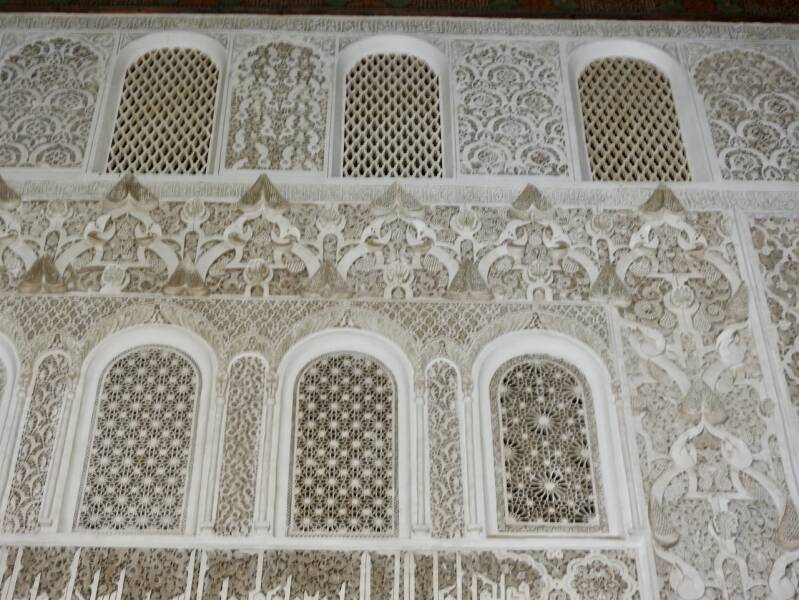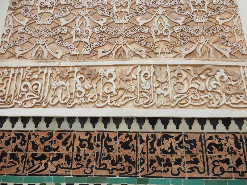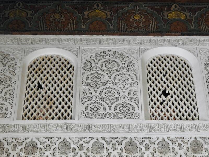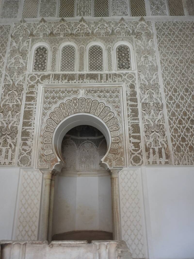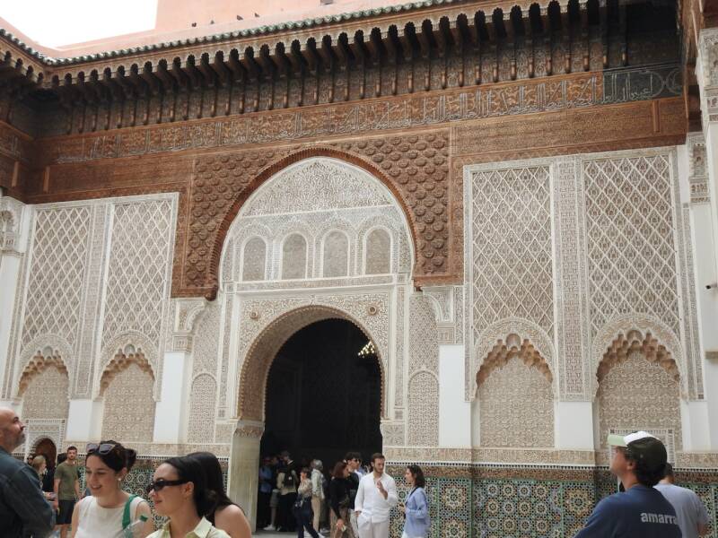 De Medersa Ben Youssef is gesticht in de 14e eeuw, het is een koranschool, een madrassa die 900 studenten kon huisvesten die in kleine kamertjes verdeeld over 2 verdiepingen woonden. Je komt al snel in een prachtige binnenplaats geplaveid met wit marmer met een bassin in het midden. De muren zijn prachtig gedecoreerd met tegelwerk in geometrische patronen die ingewikkeld zijn, zgn zellijtegels. De studentenkamers kijken op de binnenplaats uit, andere studentenkamers liggen rond weer prachtig gedecoreerde kleine binnen plaatsen. Door een soort poort kom je in de gebedsruimte met een piramidevormige koepel van cederhout en deze ruimte is door marmeren zuilen in drieën verdeeld. In de nis die de richting van Mekka aangeeft, de Mihrab, staan gekalligrafeerde verzen uit de koran. Toen we even in een file moesten staan om weer naar buiten te komen, waren we erg onder de indruk van de schoonheid en een bijzonder fraai staaltje van vakmanschap wat we hadden gezien. En dit ondanks het feit dat we we al eerder waren geweest blijft het verrassend.