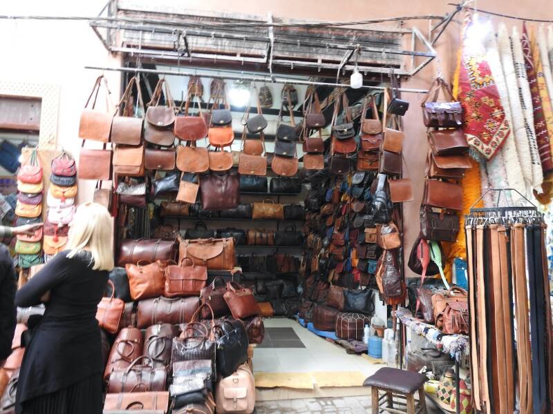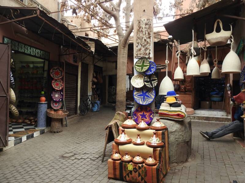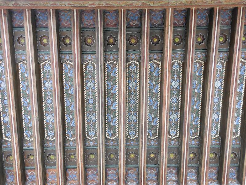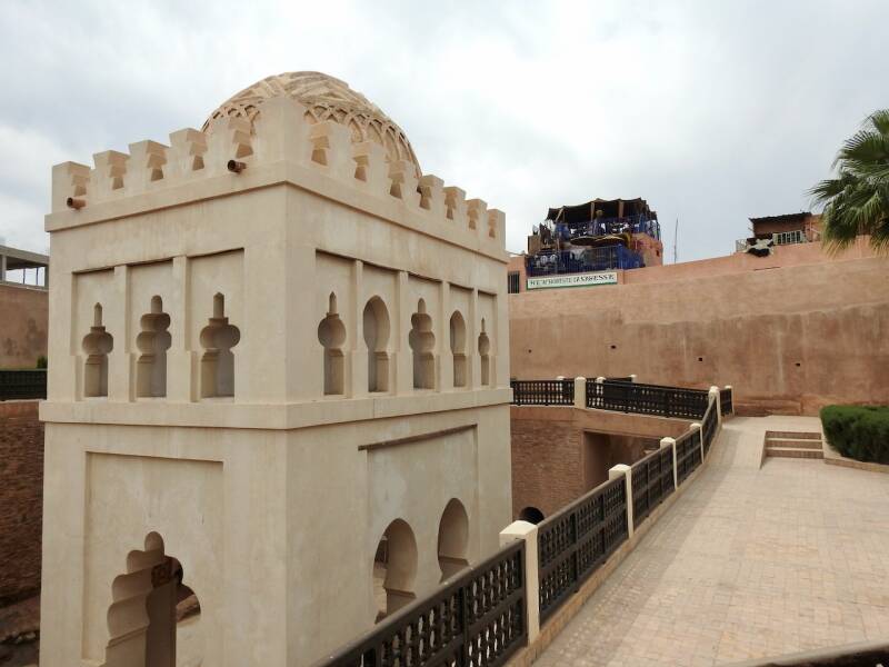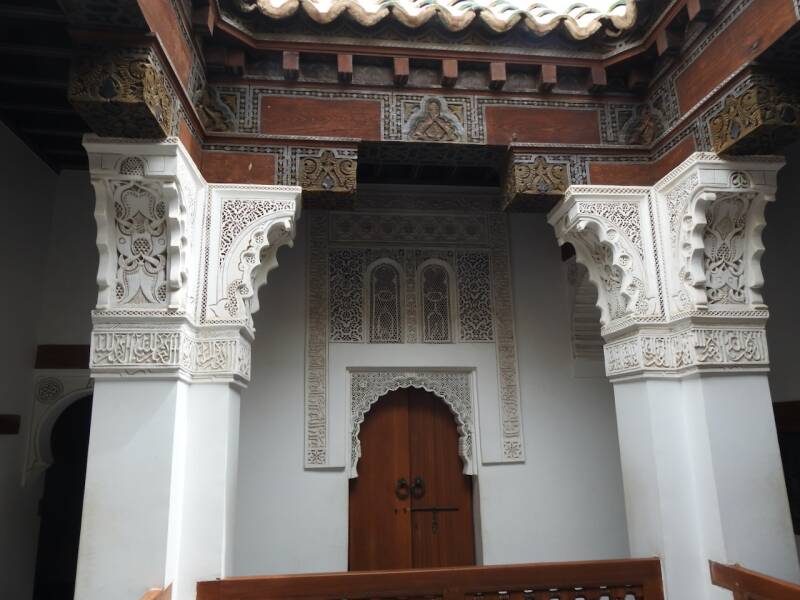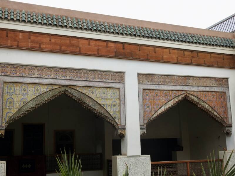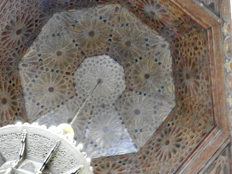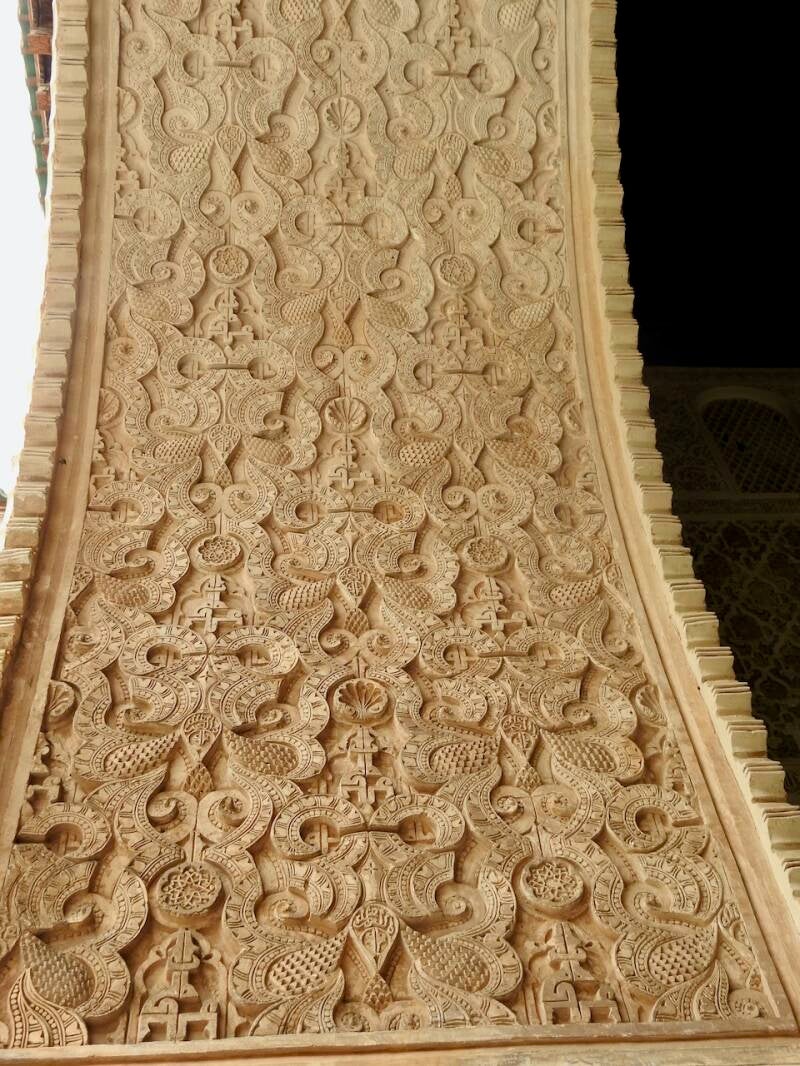 De Medersa Ben Youssef is gesticht in de 14e eeuw, het is een koranschool, een madrassa die 900 studenten kon huisvesten die in kleine kamertjes verdeeld over 2 verdiepingen woonden. Je komt al snel in een prachtige binnenplaats geplaveid met wit marmer met een bassin in het midden. De muren zijn prachtig gedecoreerd met tegelwerk in geometrische patronen die ingewikkeld zijn, zgn zellijtegels. De studentenkamers kijken op de binnenplaats uit, andere studentenkamers liggen rond weer prachtig gedecoreerde kleine binnen plaatsen. Door een soort poort kom je in de gebedsruimte met een piramidevormige koepel van cederhout en deze ruimte is door marmeren zuilen in drieën verdeeld. In de nis die de richting van Mekka aangeeft, de Mihrab, staan gekalligrafeerde verzen uit de koran. Toen we even in een file moesten staan om weer naar buiten te komen, waren we erg onder de indruk van de schoonheid en een bijzonder fraai staaltje van vakmanschap wat we hadden gezien. En dit ondanks het feit dat we we al eerder waren geweest blijft het verrassend.