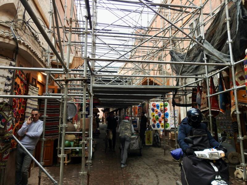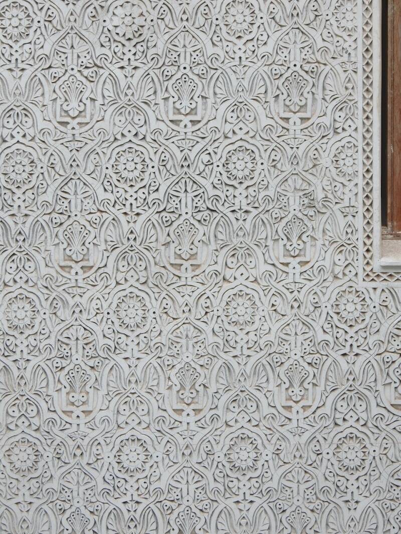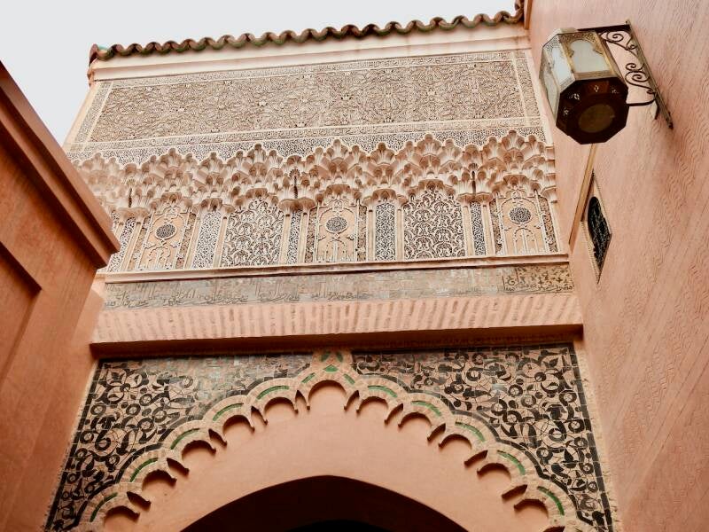 Dus zijn we naar de koranschool gewandeld en daar hadden we zeker geen spijt van. We kwamen door een klein deel van Marrakech waar we nog nooit geweest waren, een straat met winkels met Marokkaans home design. Wel liepen we door een gedeelte waar hele straten overdekt waren met steigermateriaal die muren stutten om instortingsgevaar door de aardbeving tegen te gaan. Een beetje bizar om tussen en onderdoor bouwvakkersmaterialen te lopen als toegepaste kunst. We konden nog even binnen kijken bij een Riad die verbouwd zou worden tot restaurant. Langzaam kwamen we bij de madrassa in de buurt, langzaam door de drukte in de straatjes en omdat we ook overal wilden snuffelen in leuke winkeltjes. Het was redekijk druk voor de kassa maar we hoefden niet lang te wachten.De toegang was 50 Dh pp., wat krijg je daar een fantastisch voorbeeld van Marokkaanse architectuur te zien. Overal waar je kijkt zie je schitterend bewerkte muren, vloeren of plafonds .