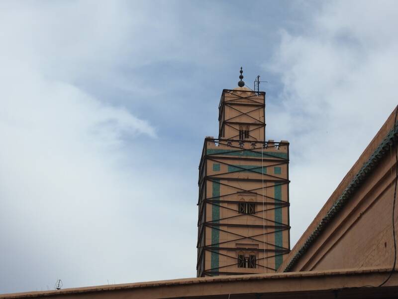 Merkwaardig genoeg was er geen oproep van de muezzin tot gebed vanaf de Koutoubia moskee, die hier op ongeveer 200 m afstand ligt., slechts gescheiden door een smalle weg en een kerkhof. Het was hier vannacht eh, muisstil om maar eens een cliché opmerking te vermijden. De moskee is een tijdje gesloten geweest wegens restauratiewerkzaamheden na schade door de aardbeving. Maar hij is weer in gebruik, gisterenmiddag was het zo druk dat gelovigen moesten bidden op het plein voor de moskee waar ook allemaal kleden lagen dus het zal wel vaker gebeuren.