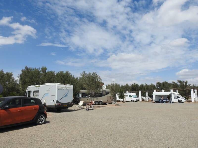 Uiteindelijk ging het helemaal niet regenen, het werd vandaag 21º. Omdat het voor een deel een doorgangscamping is was het aan het eind van de middag aardig vol met campers hier op El Ferdaous.