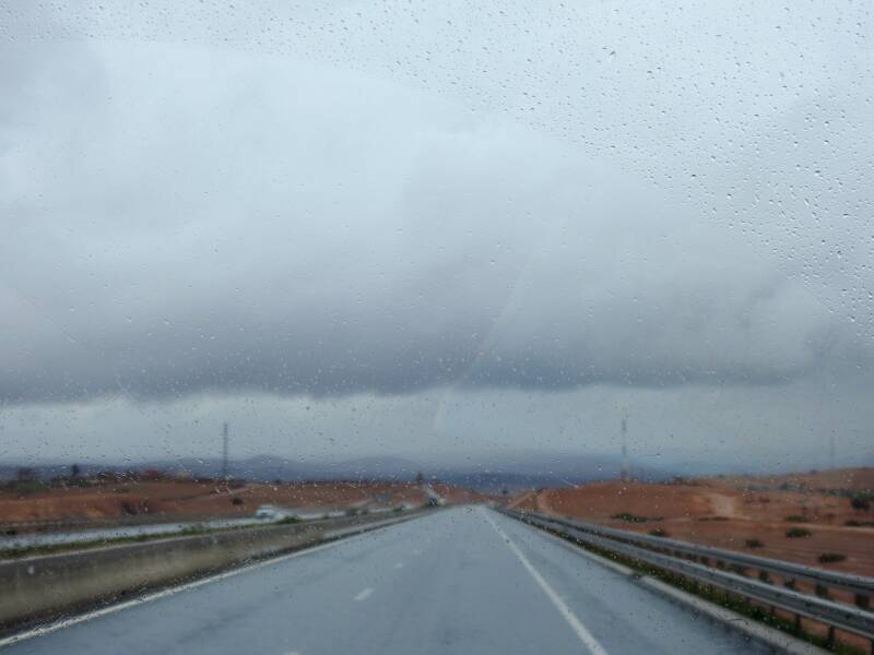Dus zijn we om een uur of 10 vertrokken, het was toen nog droog. Op de N9 stond soms wat water , we hadden toch al besloten via de tolweg te gaan. Toen we die bereikten begon het te regenen en dat ging 1,5 uur zo door. En de wind nam ook flink toe tot zo’n 70 km op de zijkant, we kachelden daarom met ongeveer 85 km over de weg. De route is saai, ook als het niet regent, eerst kale steenvlaktes, weinig dorpjes, niet veel te zien dan modderstroompjes. Maar het werd op een gegeven moment droog en de eerste bloemen verschenen in de bermen. Echter de regen maakte plaats voor felle buien zodat het weinige verkeer langzamer moest rijden. Er zaten ook windstoten in de buien, vlak voor Casablanca werd het droog maar de wind bleef. Tot onze verbazing was het bij Casablanca niet eens zo druk, dat hebben we niet eerder meegemaakt, ongetwijfeld zal het met de ramadan te maken hebben. Eenmaal Casablanca voorbij is het niet ver meer naar Mohammedia en om 13.10 uur stonden we voor de Carrefour, we moesten de voorraad weer aanvullen.