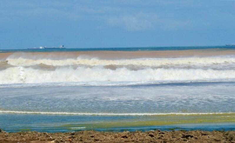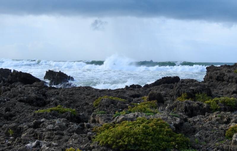 We zijn weer in Mohammedia, de branding is tamelijk onstuimig en er zit een buitje boven de oceaan.