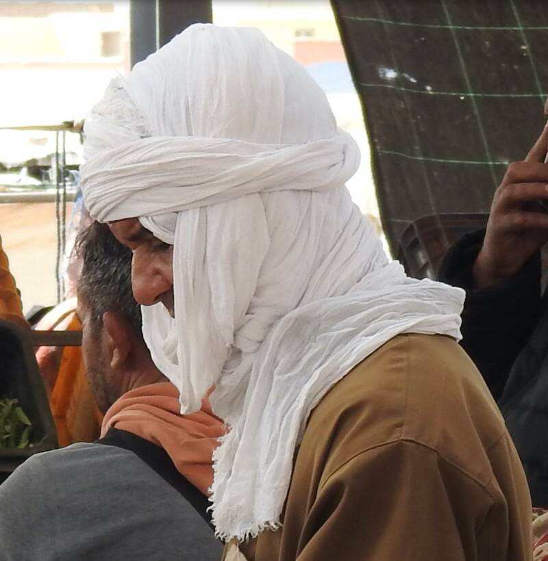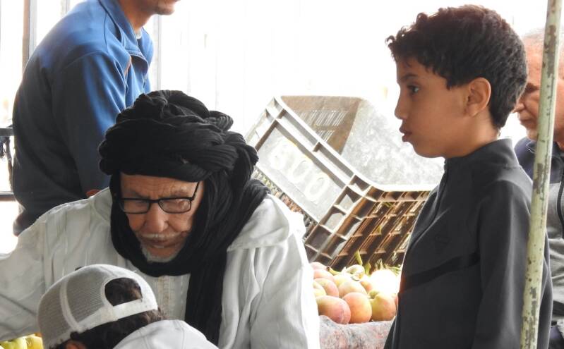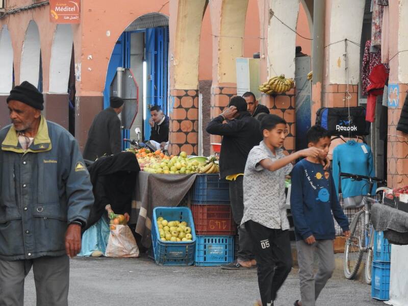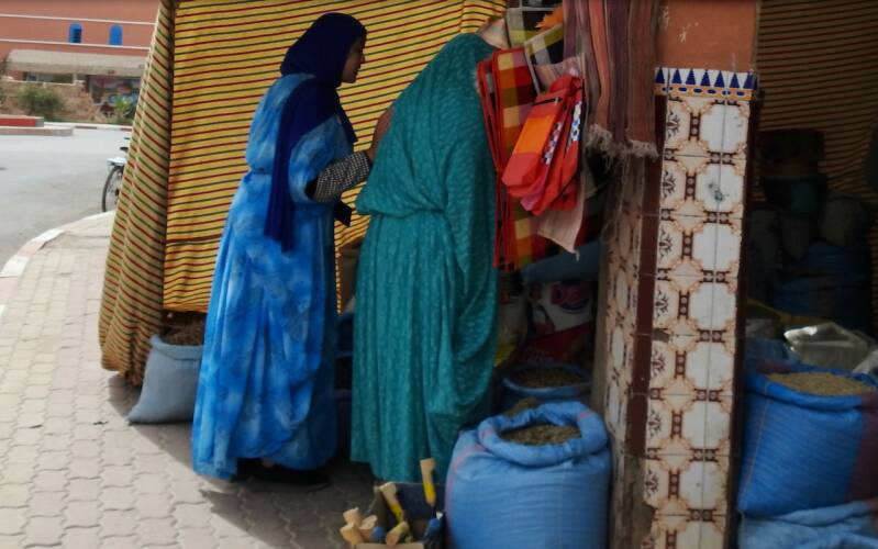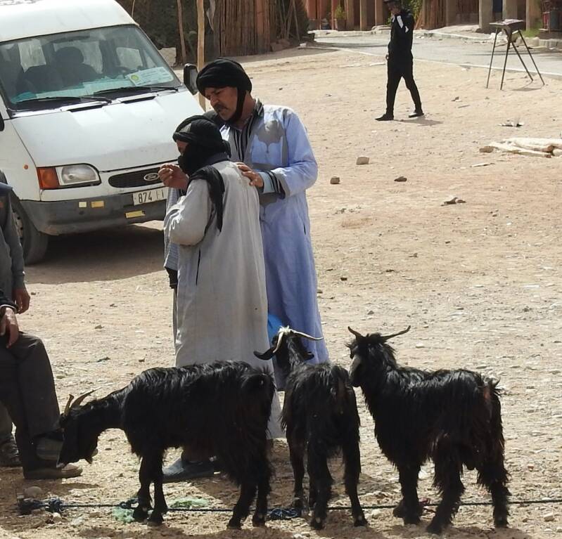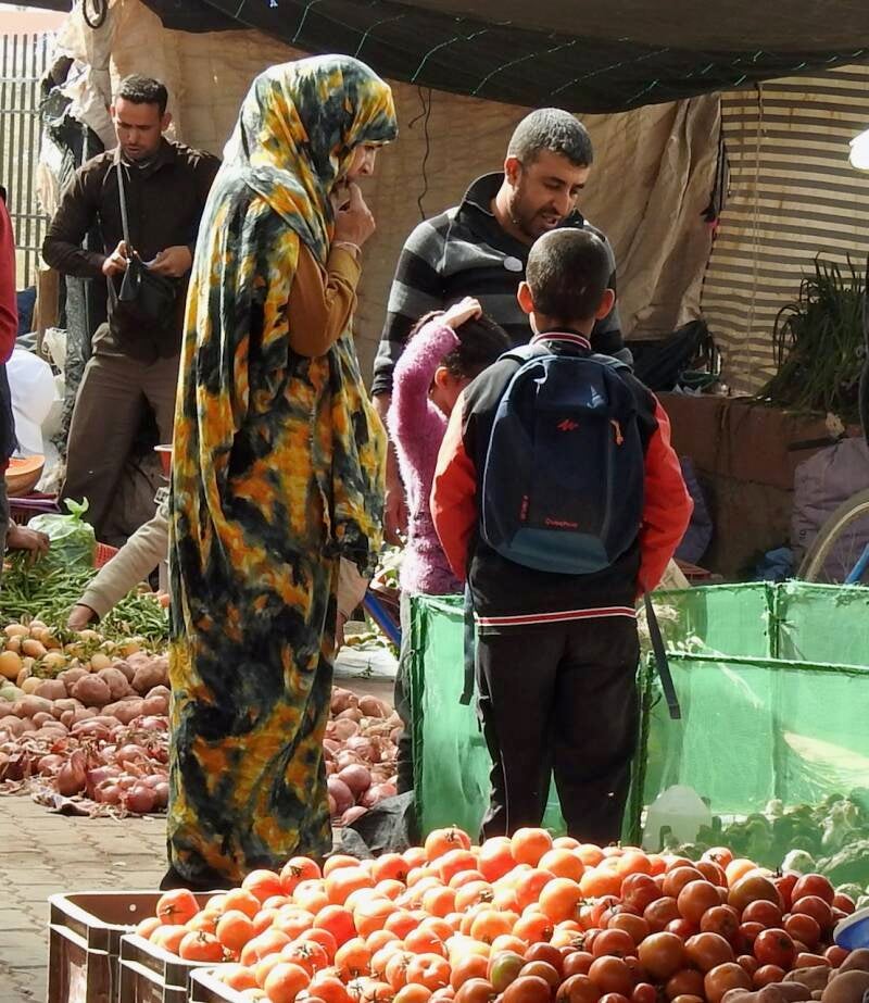 We zijn aan het eind van de ochtend naar de souk gewandeld. De souk is net buiten het dorp en is deels in een open hal zodat je beschermd bent tegen de zon. In de grote hal wordt er groente en fruit gekocht, het ziet er over het algemeen goed uit. Bij het kopen van boontjes moet je opletten dat ze niet taai zijn. De sperziebonen die in de winter in Nederland worden verkocht zijn afkomstig uit Marokko, zo vind je ze hier niet op de souk. De beste kwaliteit is voor de export bestemd. De souk is erg kleurrijk, dat komt doordat de vrouwen zo prachtig gekleed zij, Vaak een zwarte omslagdoek om en daaronder meest een lichtblauwe maar ook beige, bruin, zilverachtig of een groene lange wijde rok, vaak van glimmende rok. Er zijn hier ongeveer evenveel mannen als vrouwen op de souk. Vee wordt niet verhandeld, hooguit wat jonge geitjes en lammetjes. Wel is er een afdeling ‘Blokker’ , kleding en tajines en schalen. Er worden vrij veel kruiden verkocht maar olijven konden we niet vinden. Op de terugweg kwamen we Henk en Marita tegen , die zijn naast ons op de camping komen staan aan het begin van de middag toen wij op de souk waren.