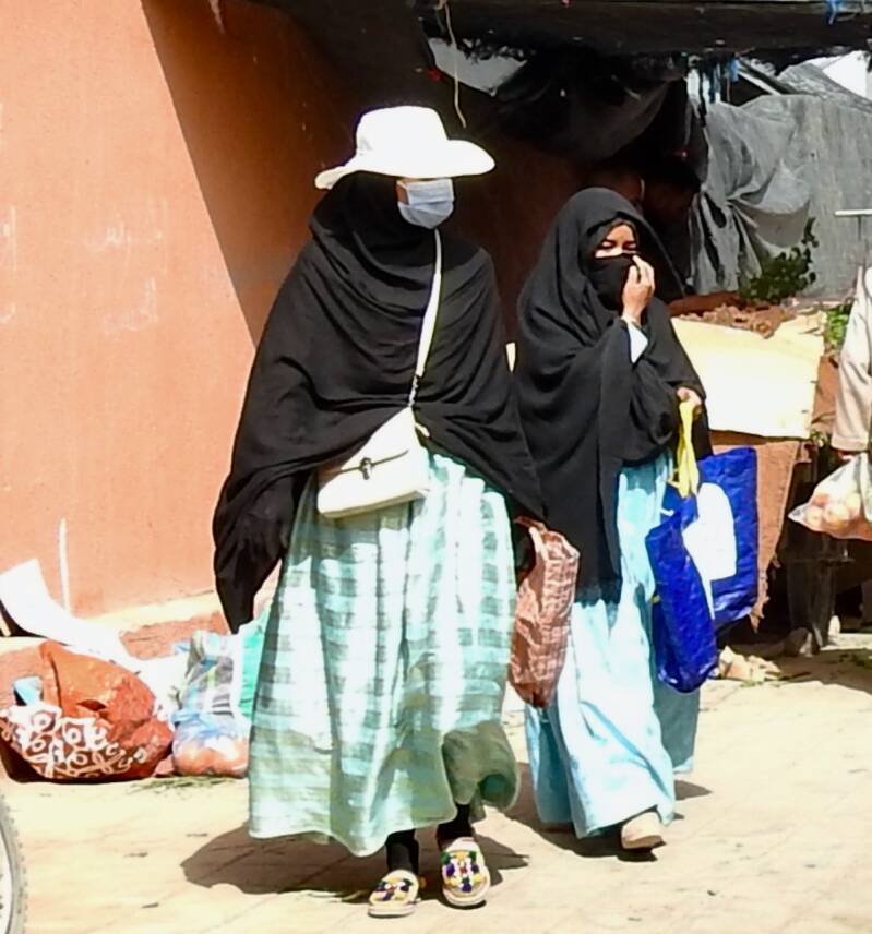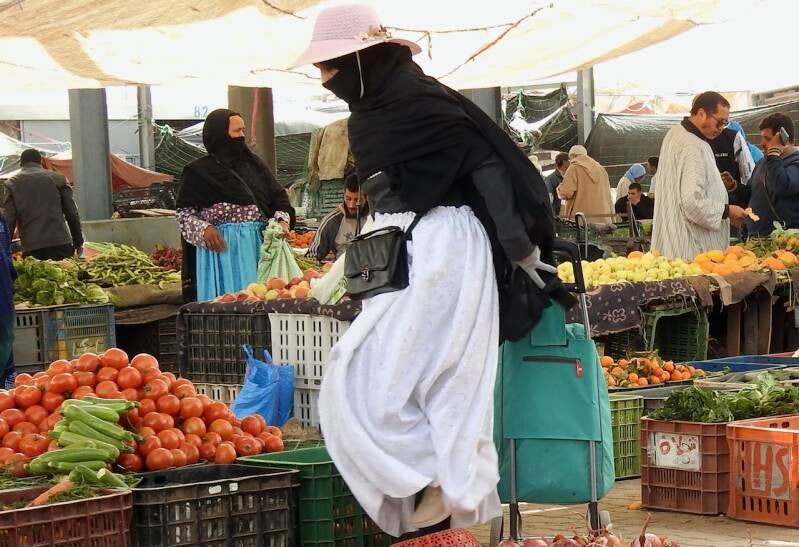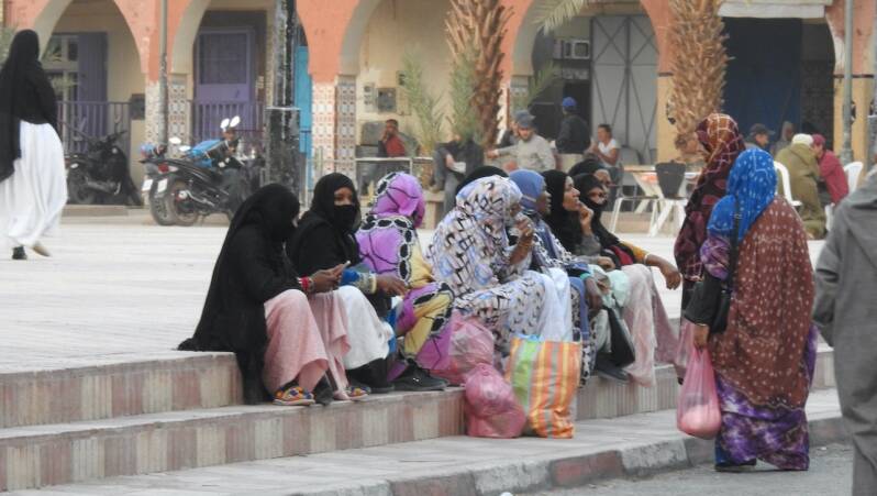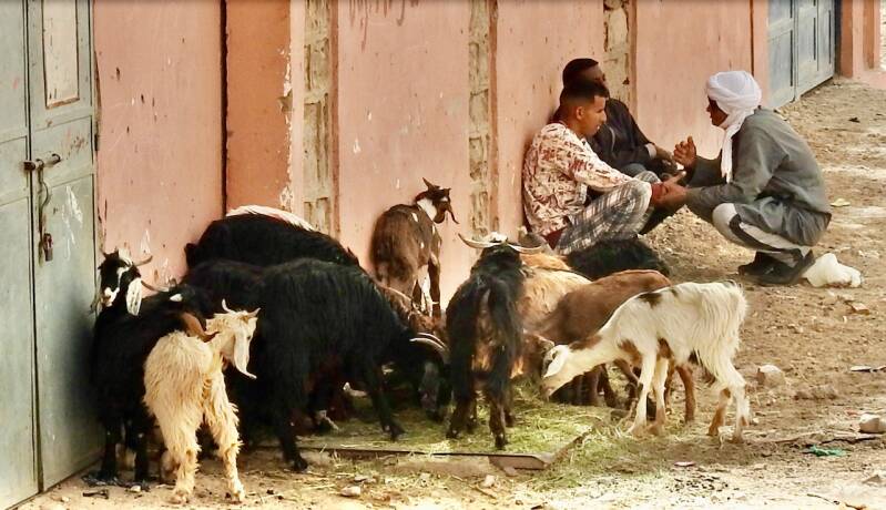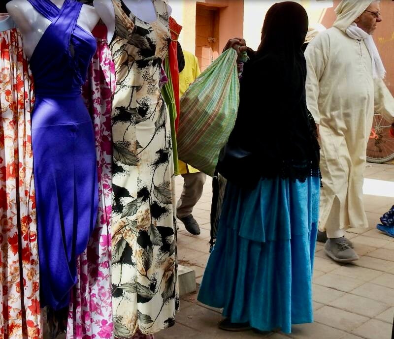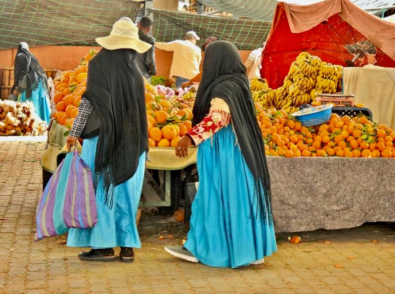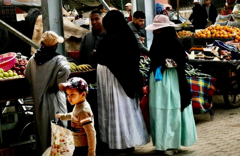 We zijn aan het eind van de ochtend naar de souk gewandeld. De souk is net buiten het dorp en is deels in een open hal zodat je beschermd bent tegen de zon. In de grote hal wordt er groente en fruit gekocht, het ziet er over het algemeen goed uit. Bij het kopen van boontjes moet je opletten dat ze niet taai zijn. De sperziebonen die in de winter in Nederland worden verkocht zijn afkomstig uit Marokko, zo vind je ze hier niet op de souk. De beste kwaliteit is voor de export bestemd. De souk is erg kleurrijk, dat komt doordat de vrouwen zo prachtig gekleed zij, Vaak een zwarte omslagdoek om en daaronder meest een lichtblauwe maar ook beige, bruin, zilverachtig of een groene lange wijde rok, vaak van glimmende rok. Er zijn hier ongeveer evenveel mannen als vrouwen op de souk. Vee wordt niet verhandeld, hooguit wat jonge geitjes en lammetjes. Wel is er een afdeling ‘Blokker’ , kleding en tajines en schalen. Er worden vrij veel kruiden verkocht maar olijven konden we niet vinden. Op de terugweg kwamen we Henk en Marita tegen , die zijn naast ons op de camping komen staan aan het begin van de middag toen wij op de souk waren.