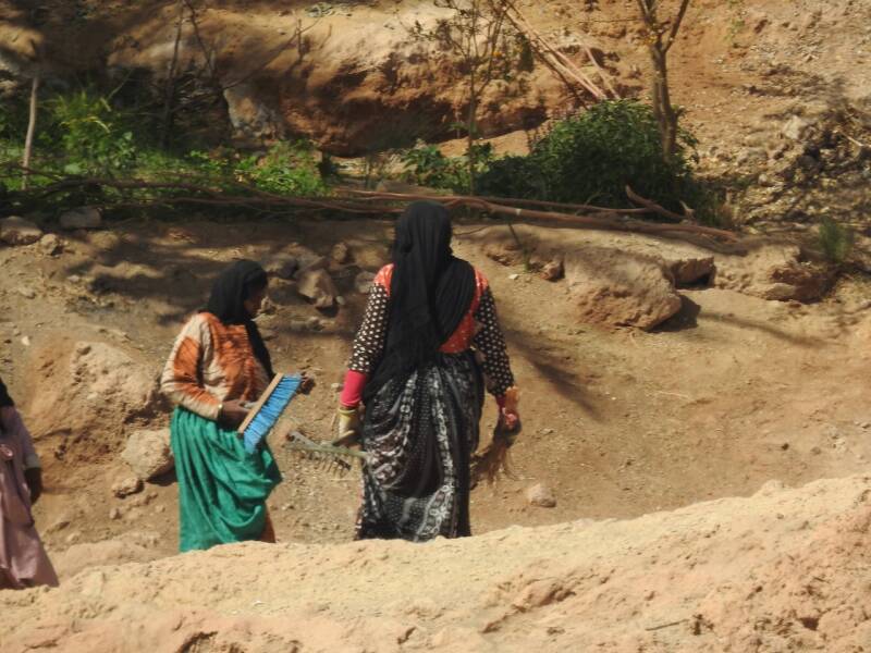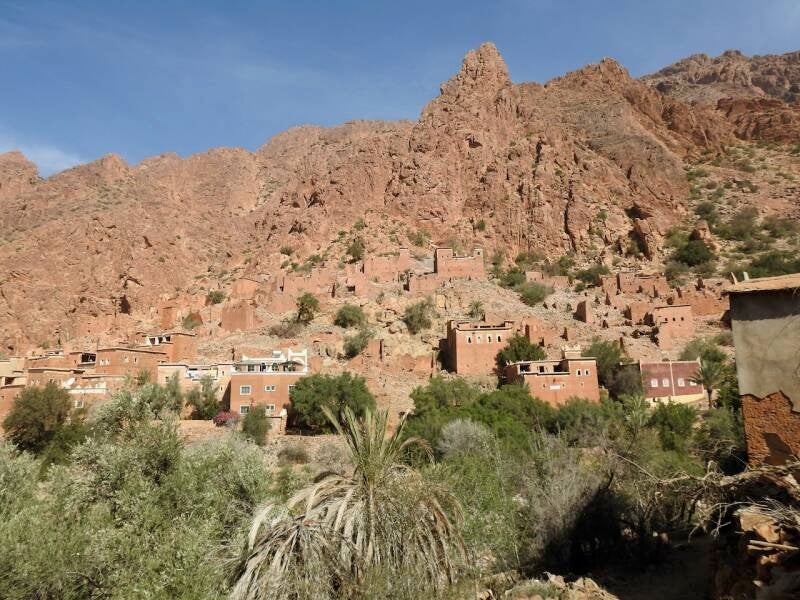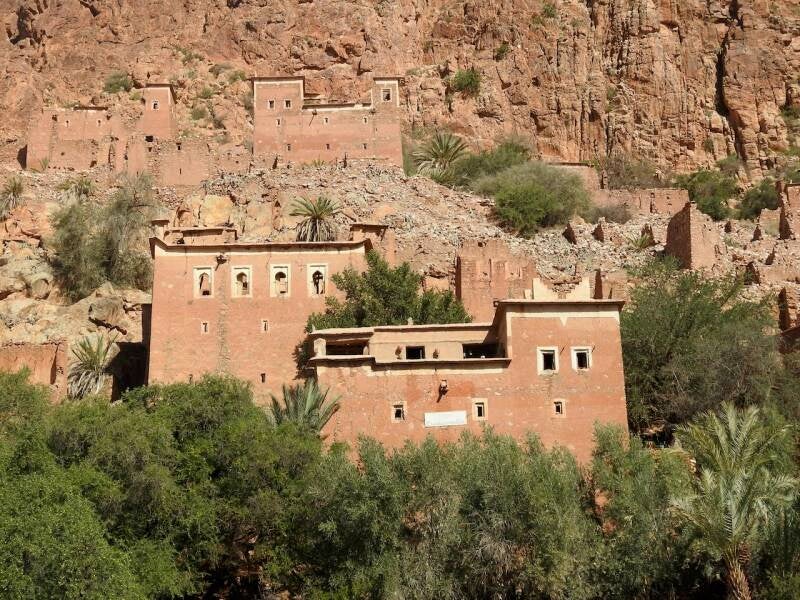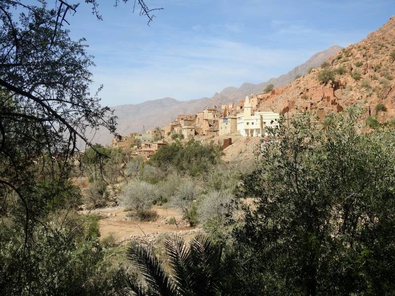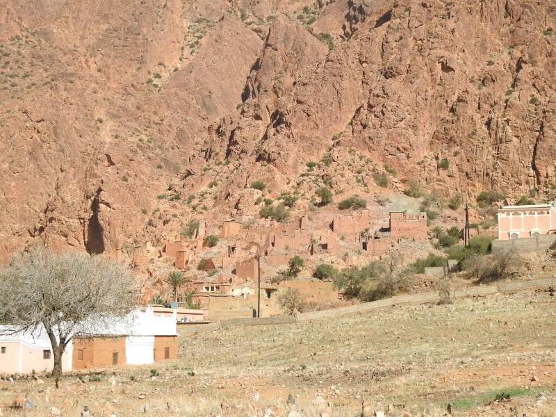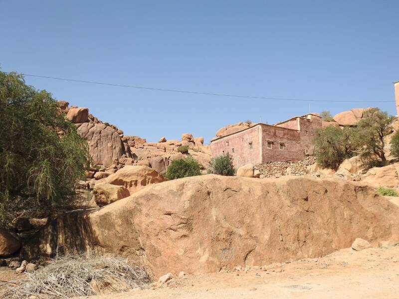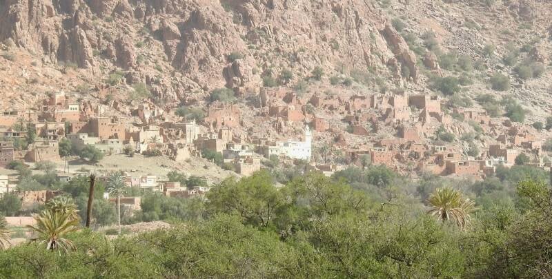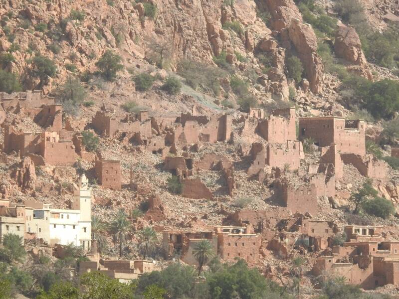 Gehucht Tafarhchicht aan de rivier Tata dat grotendeels is ingestort. vrouwen doen de was in wat poelen die er tussen de rotsen staan.