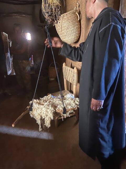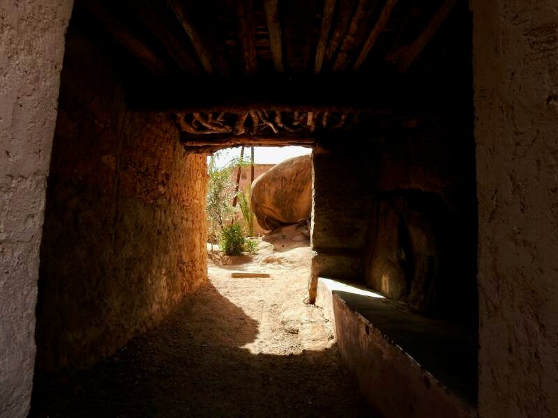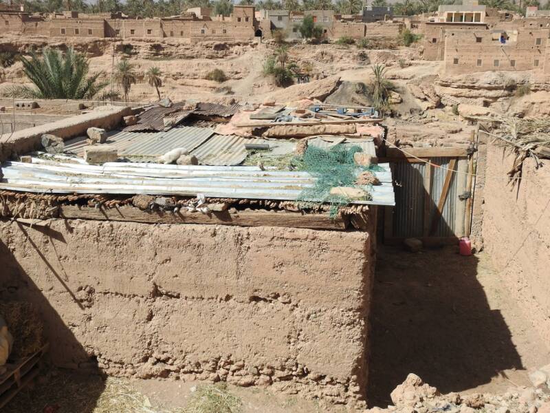 Vanmorgen zijn we met een deel van de groep naar een dorpje hier vlakbij gefietst naar een Maison Traditionelle , een klein museum. Everdien ging niet mee, we hadden gisteren 13 km gelopen dus die doet het even kalm aan. André en Marjos gingen met de muis (la souris) de naam van hun scooter. Henk en Marita waren er al geweest , die wezen Trui en Kees en mij de weg, niet zo’n moeilijke route. Oumesnat is een schitterend gelegen Berberdorpje , een km of 9 buiten Tafraout. Onderweg erheen hebben we foto’s gemaakt van de dorpjes in de Ammelnvallei, ieder gehucht heeft zijn eigen moskee. Er heerste een onbeschrijfelijke rust in de Ammelnvallei, wat een fijne sfeer. De laatste paar 100 meter moesten we wandelen naar het huis waar we werden ontvangen door de nog tamelijk jonge vrouw des huizes. Ze vertelde dat in de eerste ruimte arganolie en amandelen werden vermalen in een stenen handmolen, alle restafval ging naar het vee. In een kleine ruimte ernaast werd graan vermalen tot meel. Het vee, koeien, stond in kleine stallen.