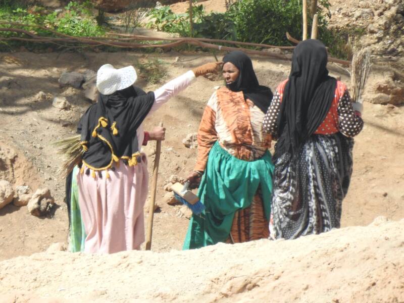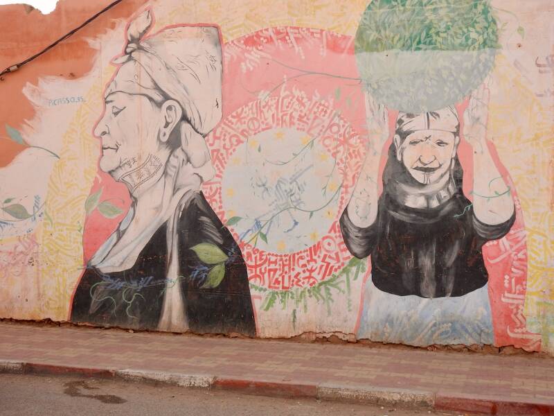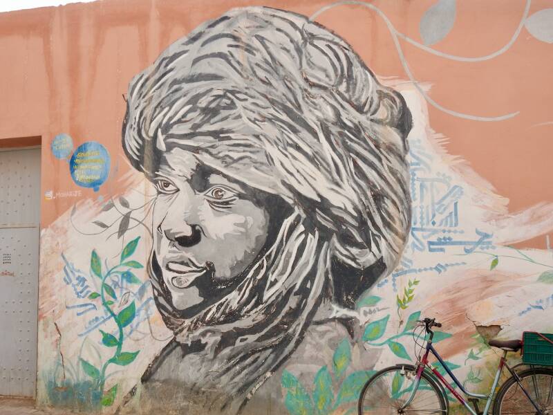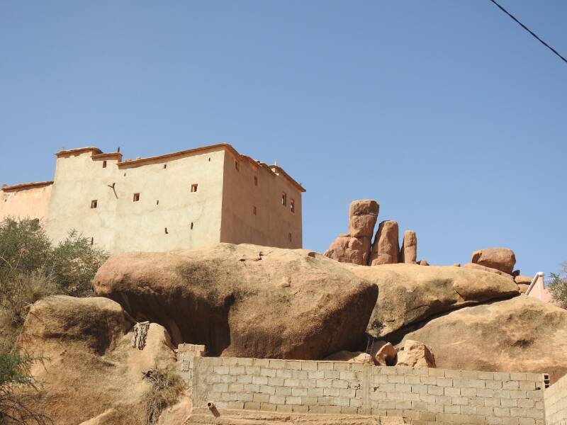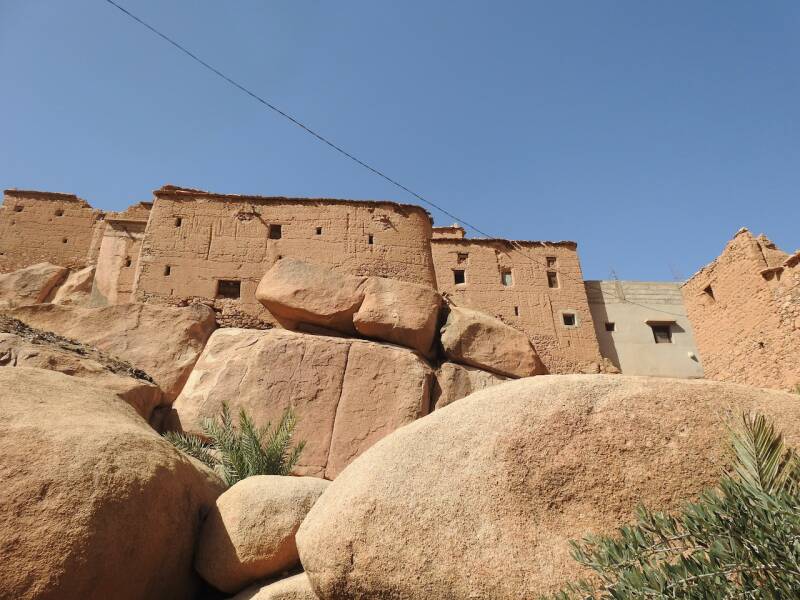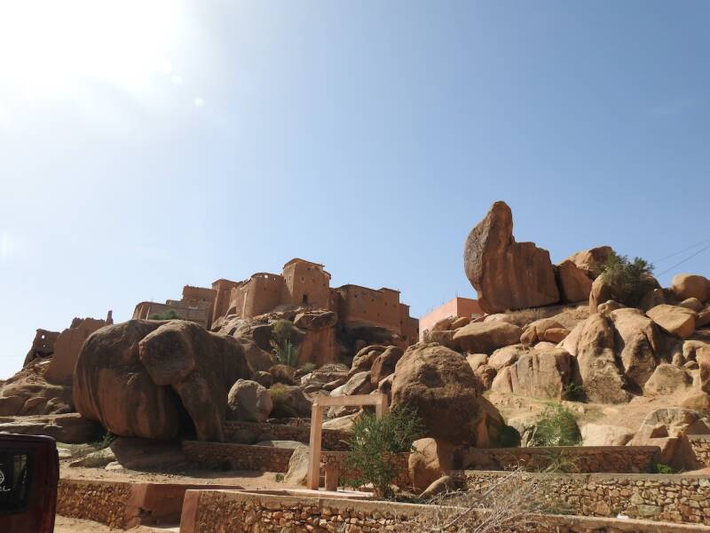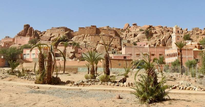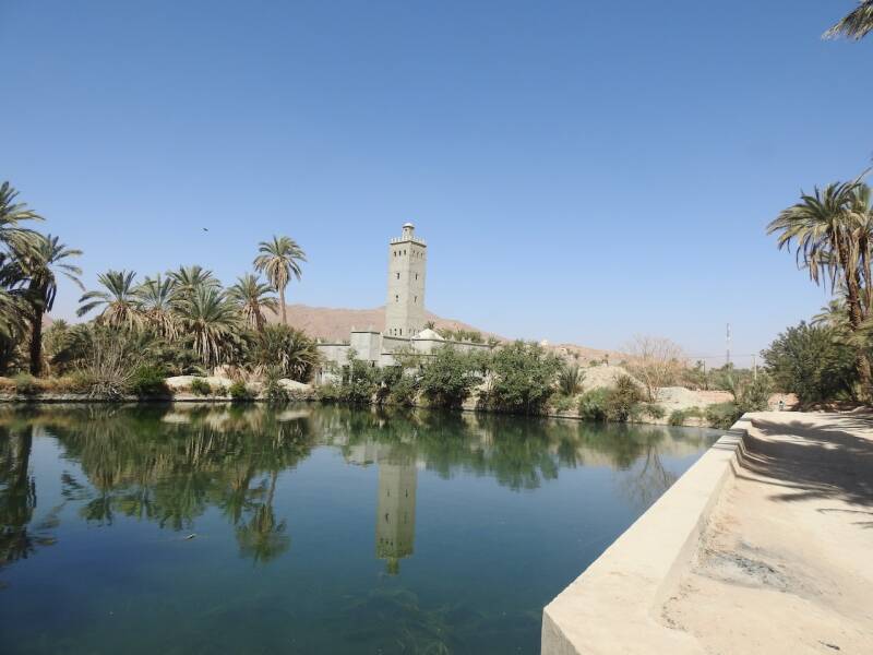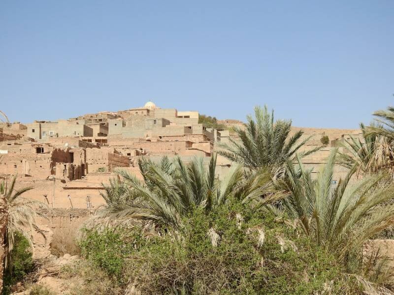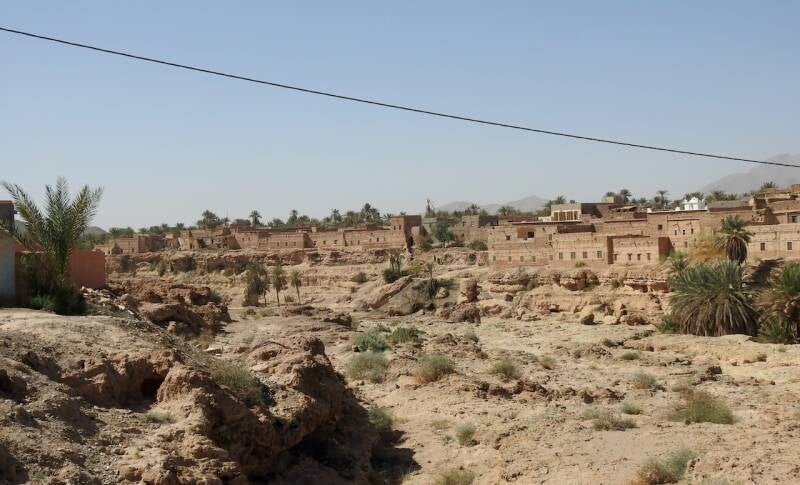 Na wat huishoudelijke werkzaamheden, Everdien deed opnieuw wat handwas, zijn we vanmorgen gaan wandelen richting het dorp met zijn eeuwenoude waterklok. Een leuke wandeling waarbij je al snel bij de rivier Tata komt nadat je een immense grote begraafplaats bent gepasseerde. Die staat leeg op wat poelen na waar een paar vrouwen de was deden. Aan de andere kant van de rivier ligt het gehucht Tafarhchicht dat grotendeels ingestort is.