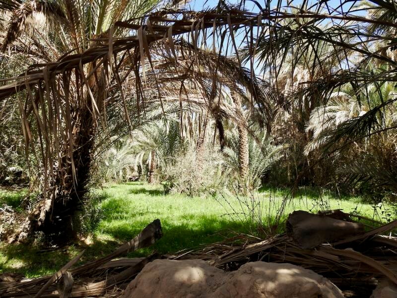 We hebben daar even doorheen gewandeld onder huizen door door en hele gangetjes tot we niet verder konden omdat het boven de gangen liggende huis helemaal was ingestort. Daarna volgde een mooie wandeling door de palmentuin die er goed bij staat doordat de percelen veevoer de er onder worden verbouwd door een irrigatiesysteem bevloeid worden. We zagen zowaar libellen en wat vlinders vliegen. Naast een soort retentievijver werd een moskee gebouwd, er woont daar geen kip, er staan slechts enkele huizen. Langs een kerkhofje kwamen we bij het dorp Agadir Lehne donderdag, waar de waterklok is . In dat gebouwtje zei Everdien maar er was niets te zien. 2mannen die daar stonden zeiden dat de waterklok niet meer bestond, alles gaat weg, huizen storten in, werk is er niet. In 2000 nog bezocht Zie voor een beschrijving Marokko 2016 deel 2 ( Tata 10-03-2016 donderdag). Op de terugweg liepen er enkele jonge tienermeiden met ons mee en we wisselenden wat vragen uit. Ze leren Arabisch, Frans en Engels op school wat talen betreft, geen Amazigh. Al giechelend namen ze afscheid. Terug bij de hut hadden we een fijne wandeling van bijna 10 km gemaakt.