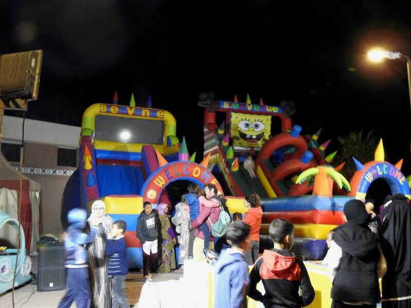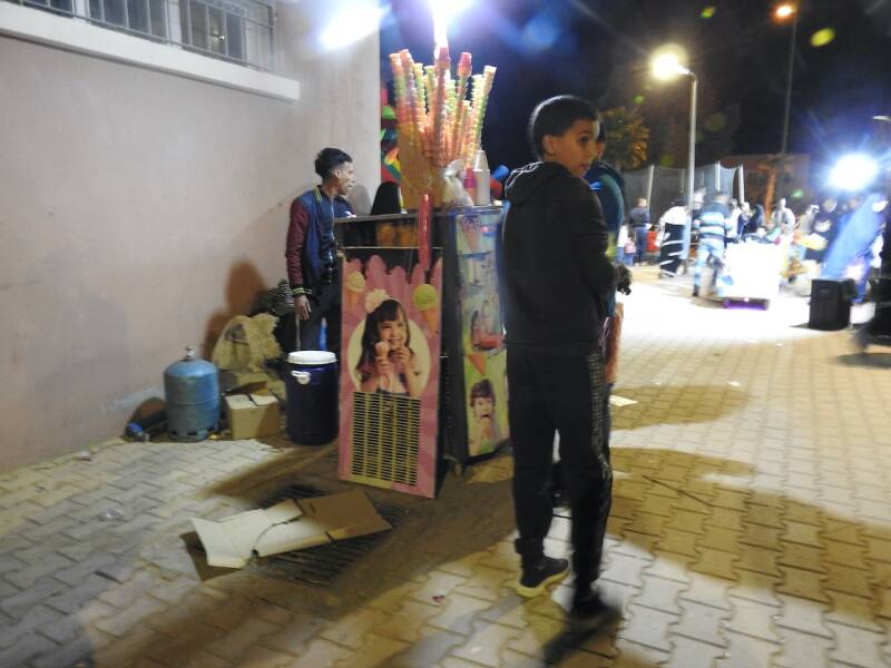 Gisterenavond ben ik met Kees en Trui naar het festivalterrein gegaan, Everdien voelde zich niet fit genoeg. Er was een klein soort kermis met een Marokkaanse versie van de Kop van Jut, je moest een schuif met gewichten over een soort ladder zo hoog mogelijk naar boven proberen te gooien. Verder een stuk of 4 schietkraampjes die niet veel klandizie hadden. De jeugd had meer belangstelling voor bordspelen waar je door een Dirham op een cijfertje te gooien geld kon verdienen. Er waren 2 opblaaskussens, er reed een minitreintje en zowaar een ijscokarretje met softijs. We hebben gekeken naar het optreden van een dames zanggroep uit Ouarzazate begeleid op trommels door een paar mannen. De zang begon langzaam en werd hoe langer hoe meer opzwepend. De vrouwen zongen met afgeknepen hoge stemmetjes net zoals Nederlandse sportmeisjes vaak hebben. Na een uur hield ik het wel voor gezien. Kees en Trui bleven nog even bij een paar andere Avondrood + leden die inmiddels zich onder de feestgangers bevonden. Jammer dat er een erg slechte belichting was, vanachter het podium schenen schijnwerpers op de ruggen van de artiesten. De foto’s zijn van een kwaliteitje waardeloos geworden.